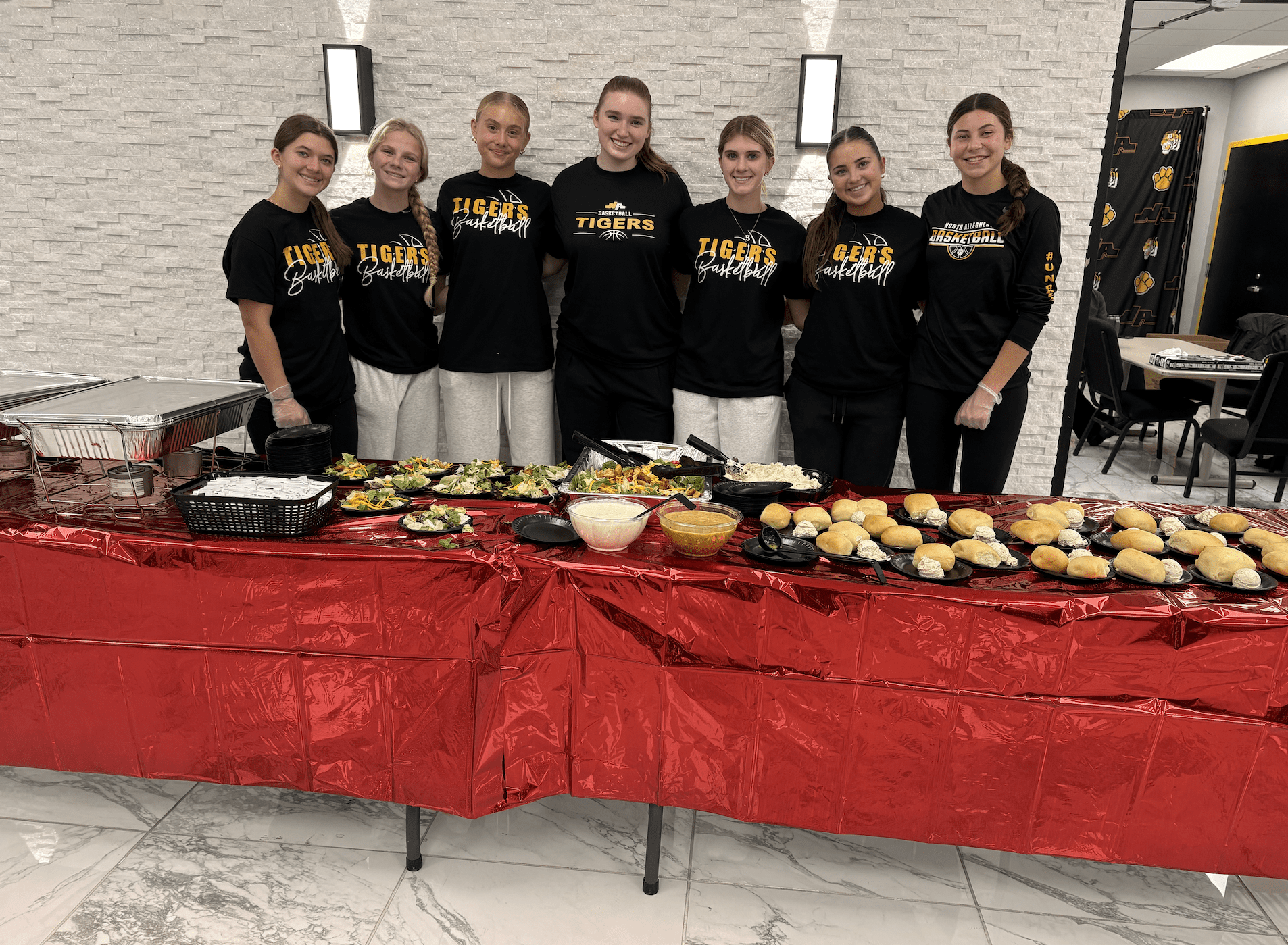 Women's team in Tigers shirts standing behind a buffet table with salad and bread.