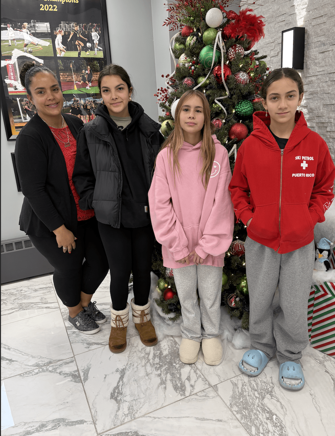 Family posing by a decorated Christmas tree indoors, with festive ornaments and smiling faces.