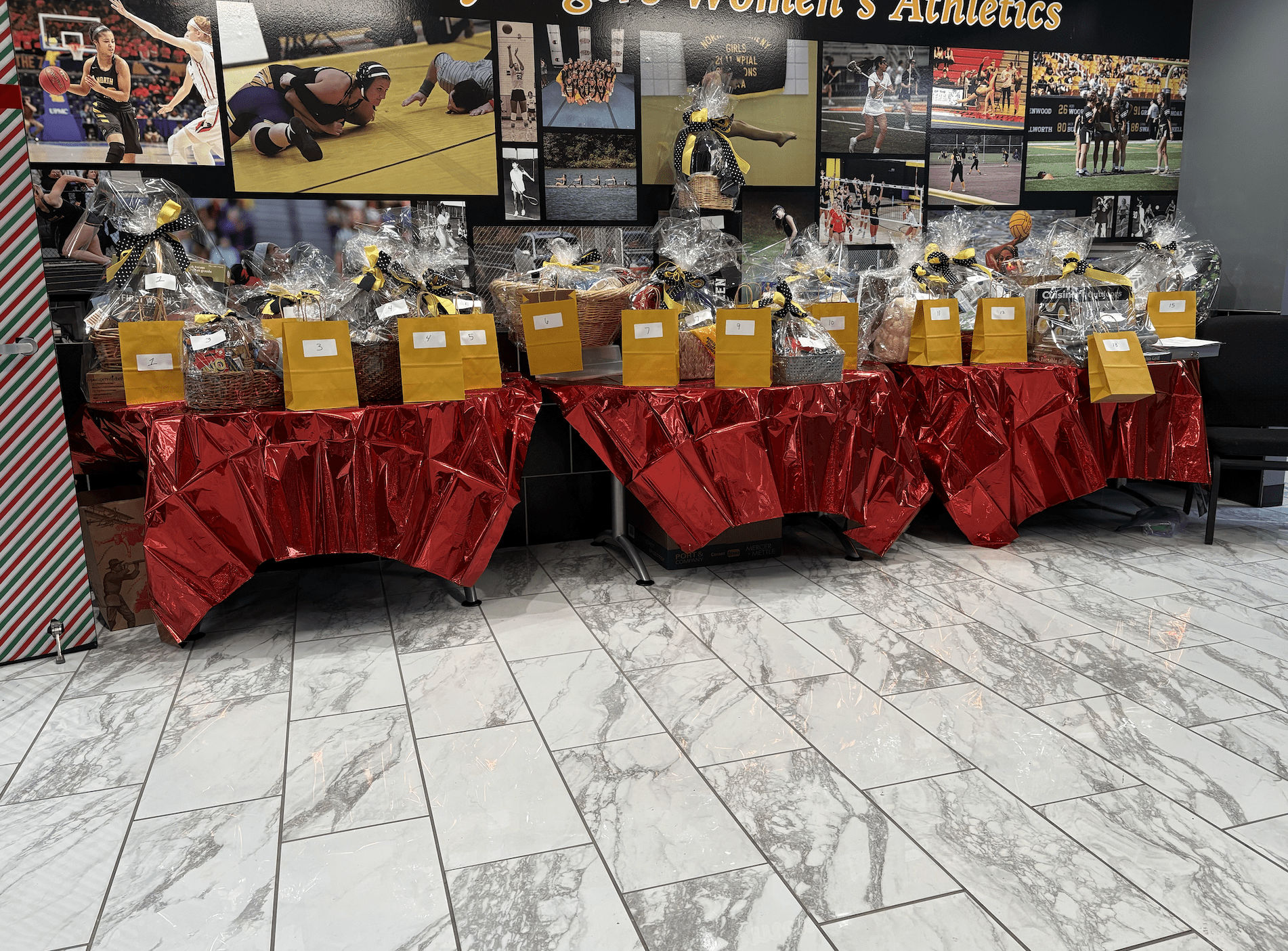 Sports event raffle prizes on tables with red covers, featuring yellow gift bags and wrapped baskets.