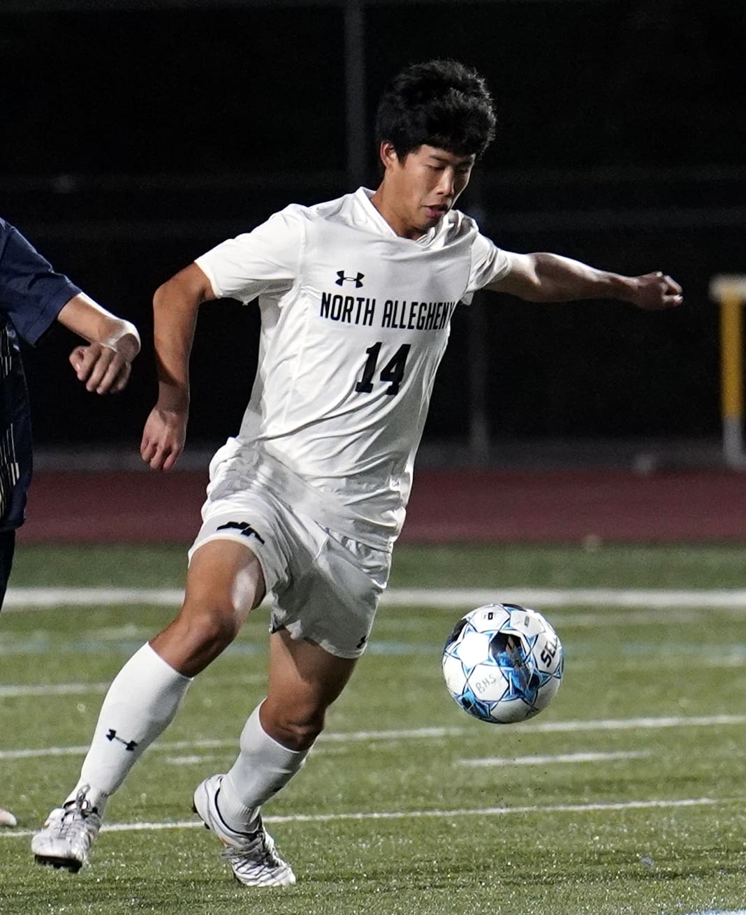 Soccer player in white uniform kicking ball on field at night match.