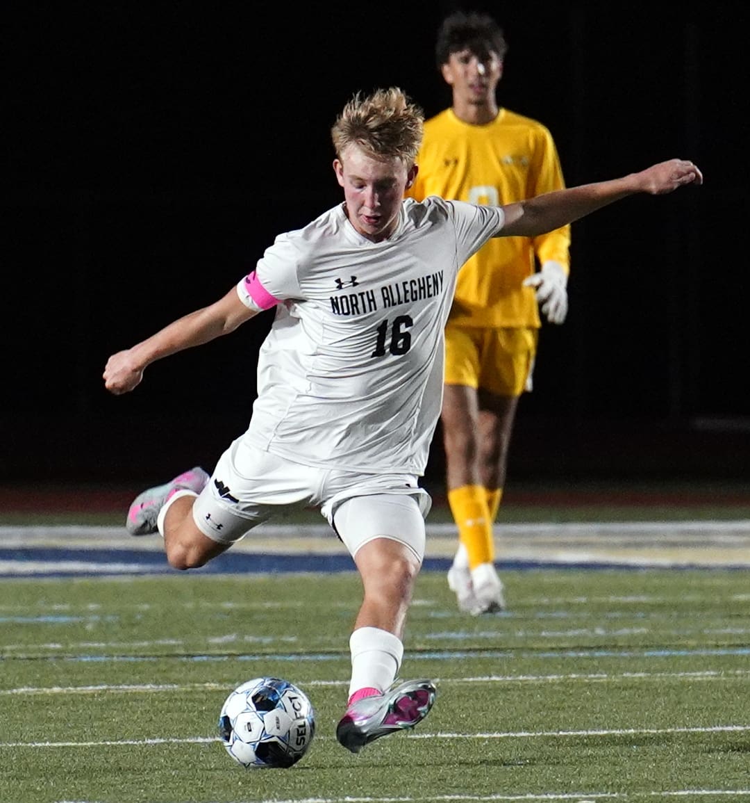 Soccer player in white jersey kicks ball mid-action during nighttime match, with player in yellow in background.