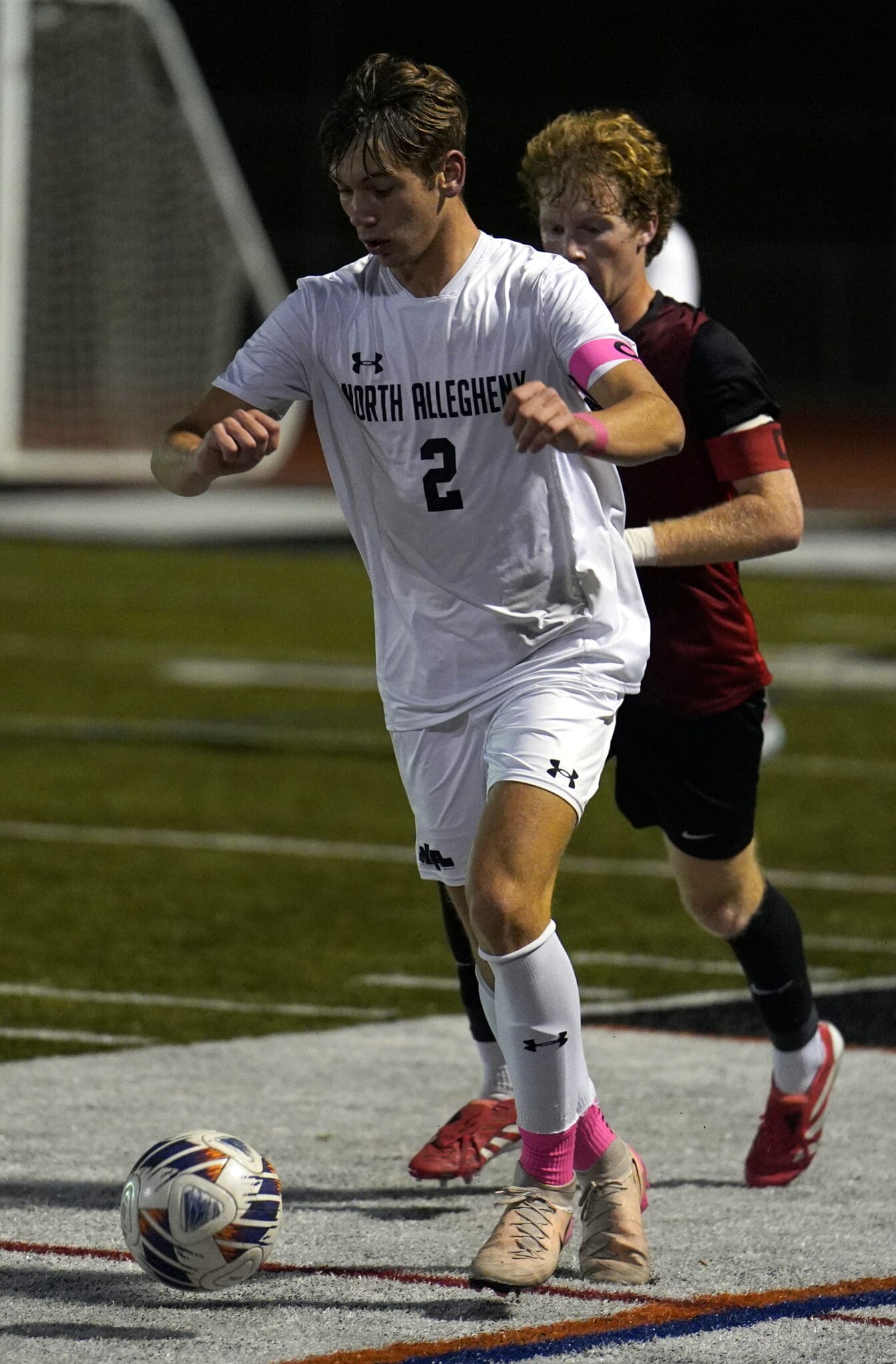 Soccer match action with player in white, number 2, controlling the ball on the field.