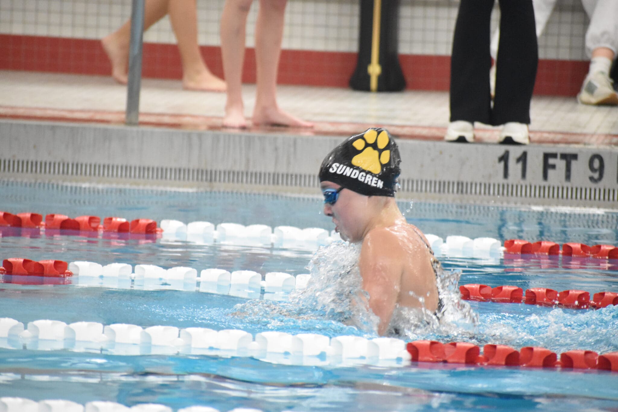 Swimmer in a pool competes in a race, wearing goggles and a swim cap, with a focus on technique.