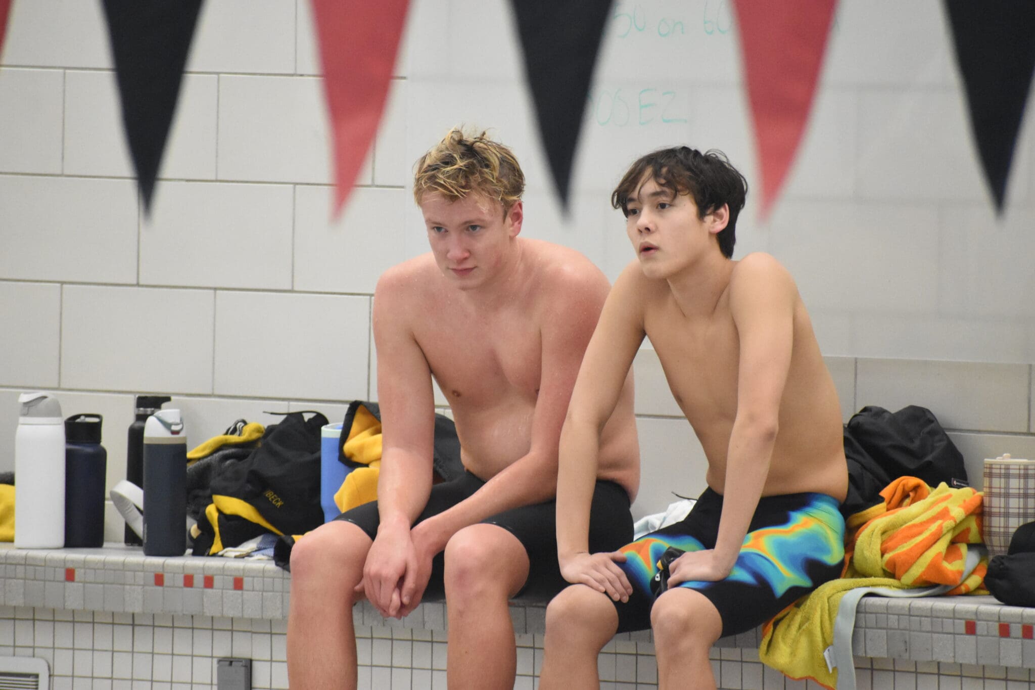 Two male swimmers rest poolside, surrounded by towels and water bottles, in a tiled indoor swimming facility.
