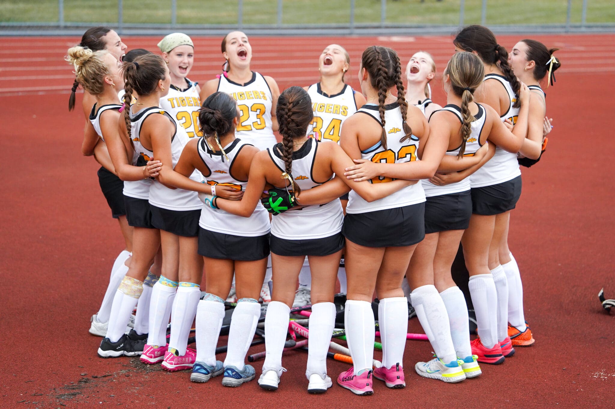 Girls' field hockey team in a huddle, wearing white jerseys, bonding before a game on a track field.