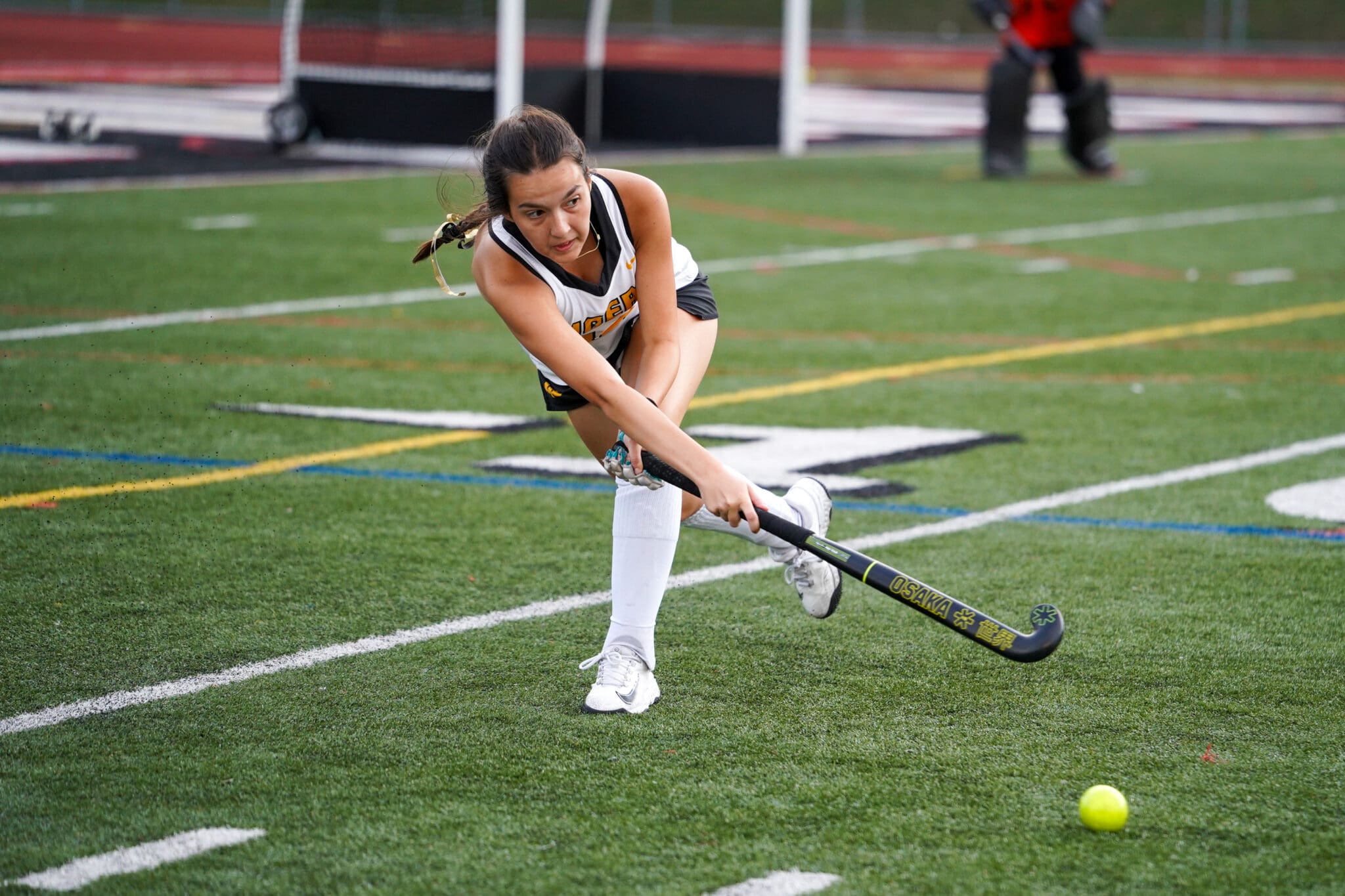 Female field hockey player in action, striking ball on turf field during a competitive match.