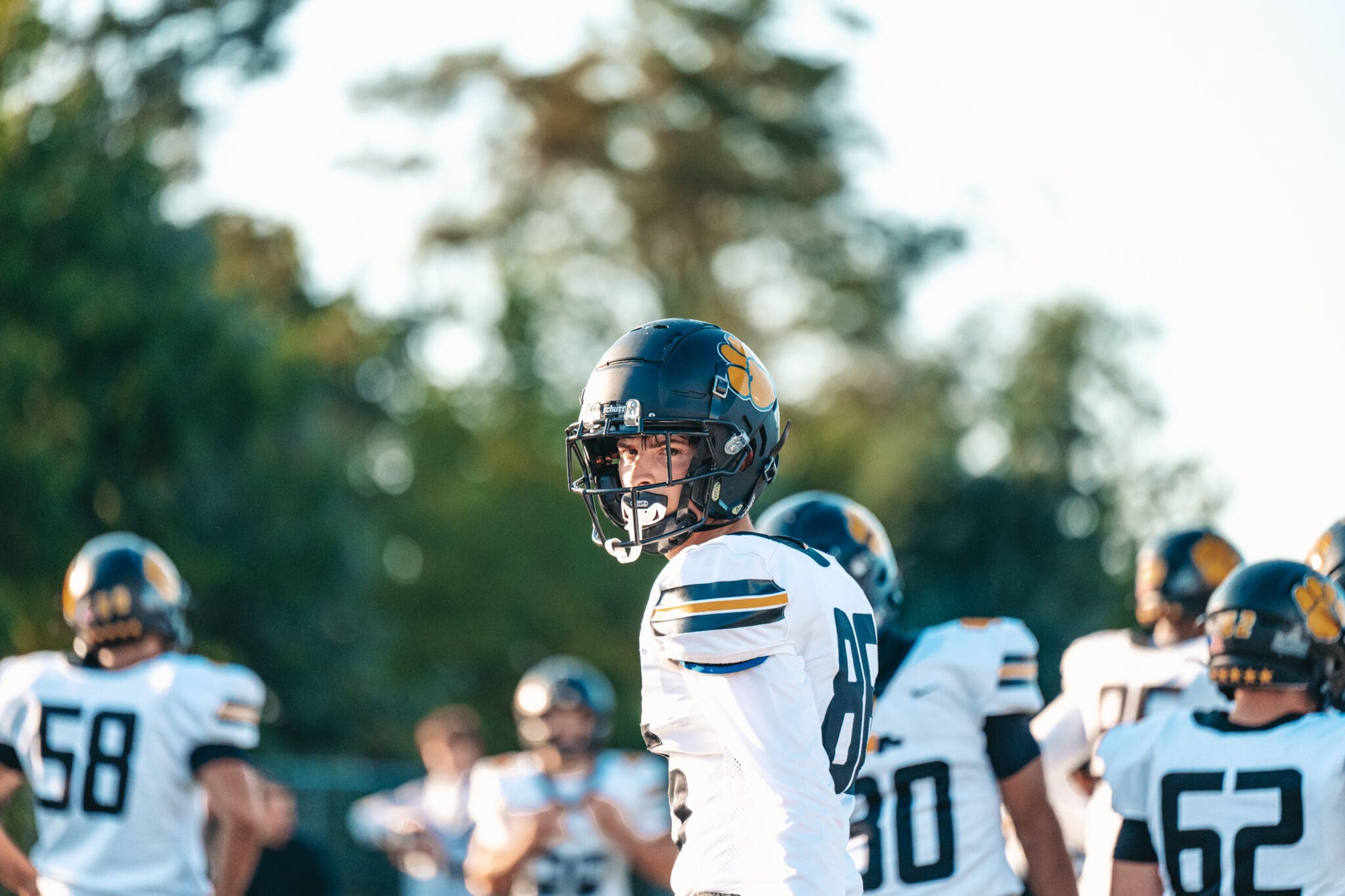 Football player in white jersey and helmet on field with teammates during game.
