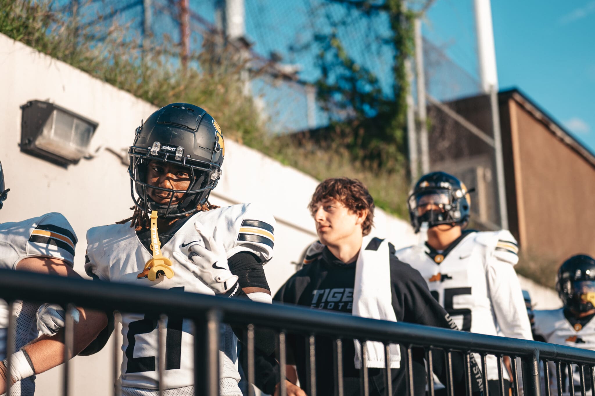 Football players in uniform walking onto the field, preparing for a game, sunny day.
