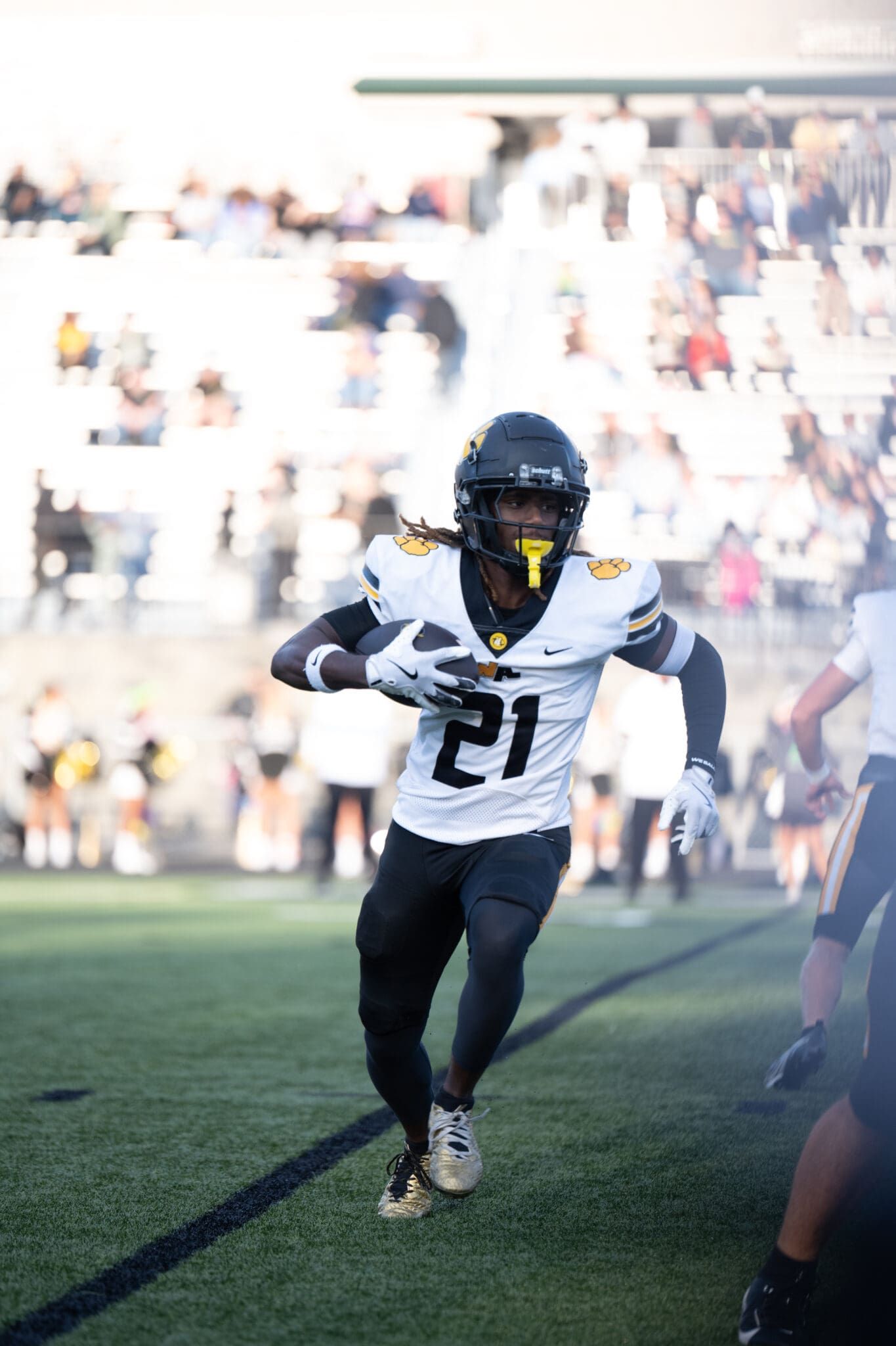 Football player in white and black uniform running with the ball on a field during a game.