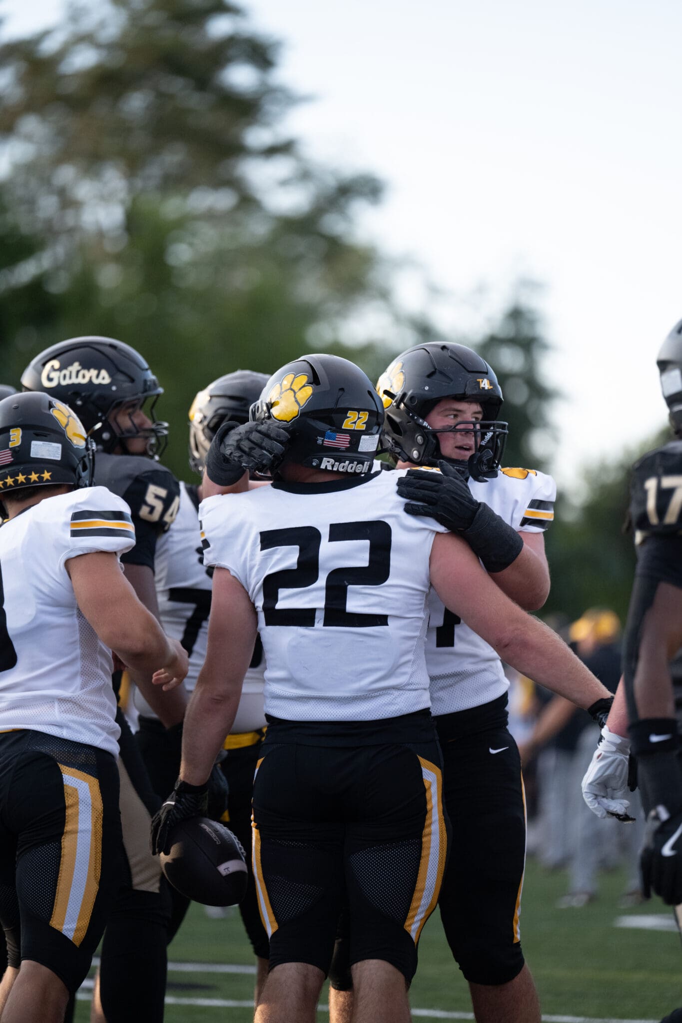 Football players in black and white jerseys celebrating a play on the field.