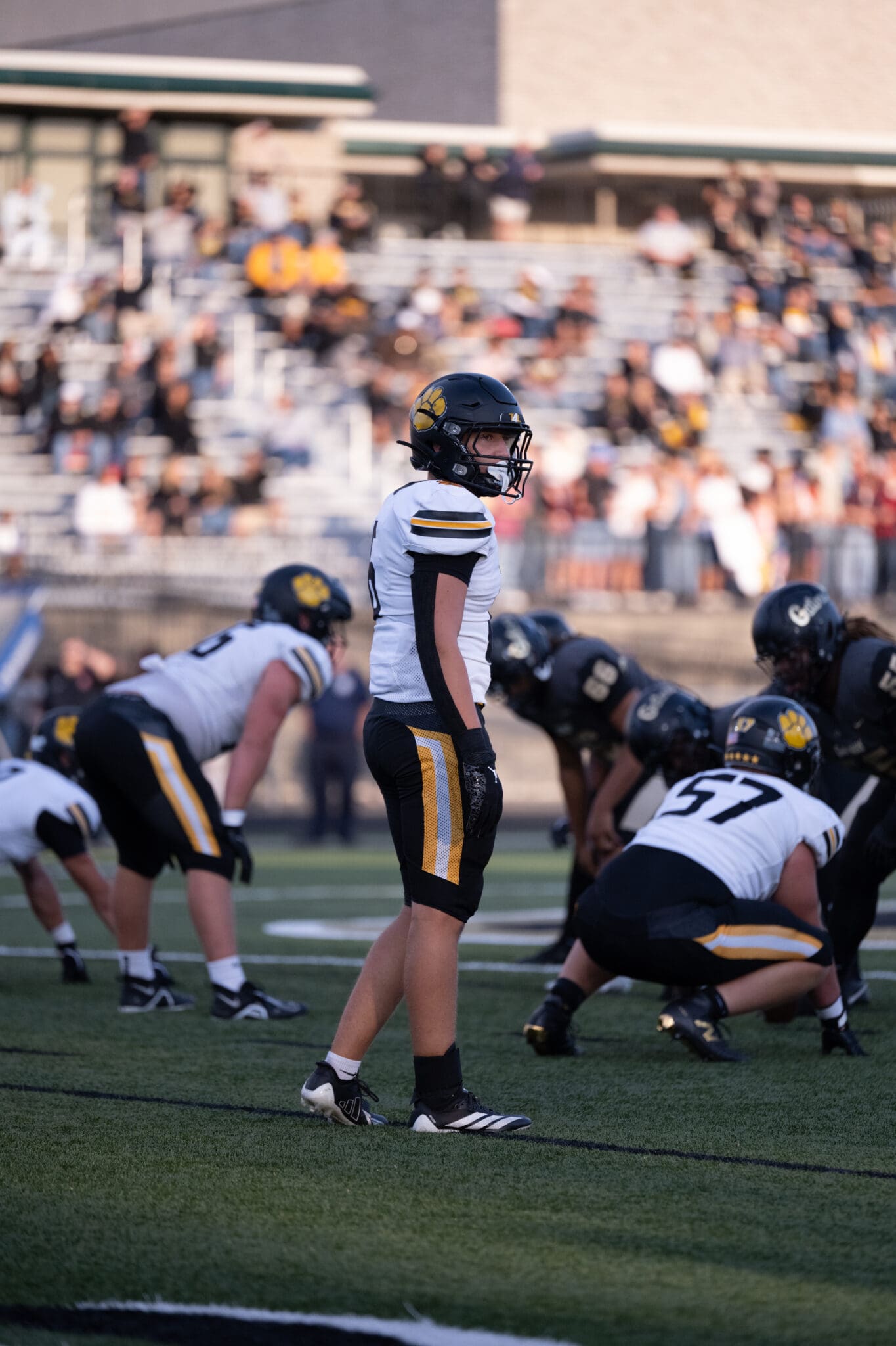 High school football game with teams in action on the field, focused player in white and black gear, crowded stands.