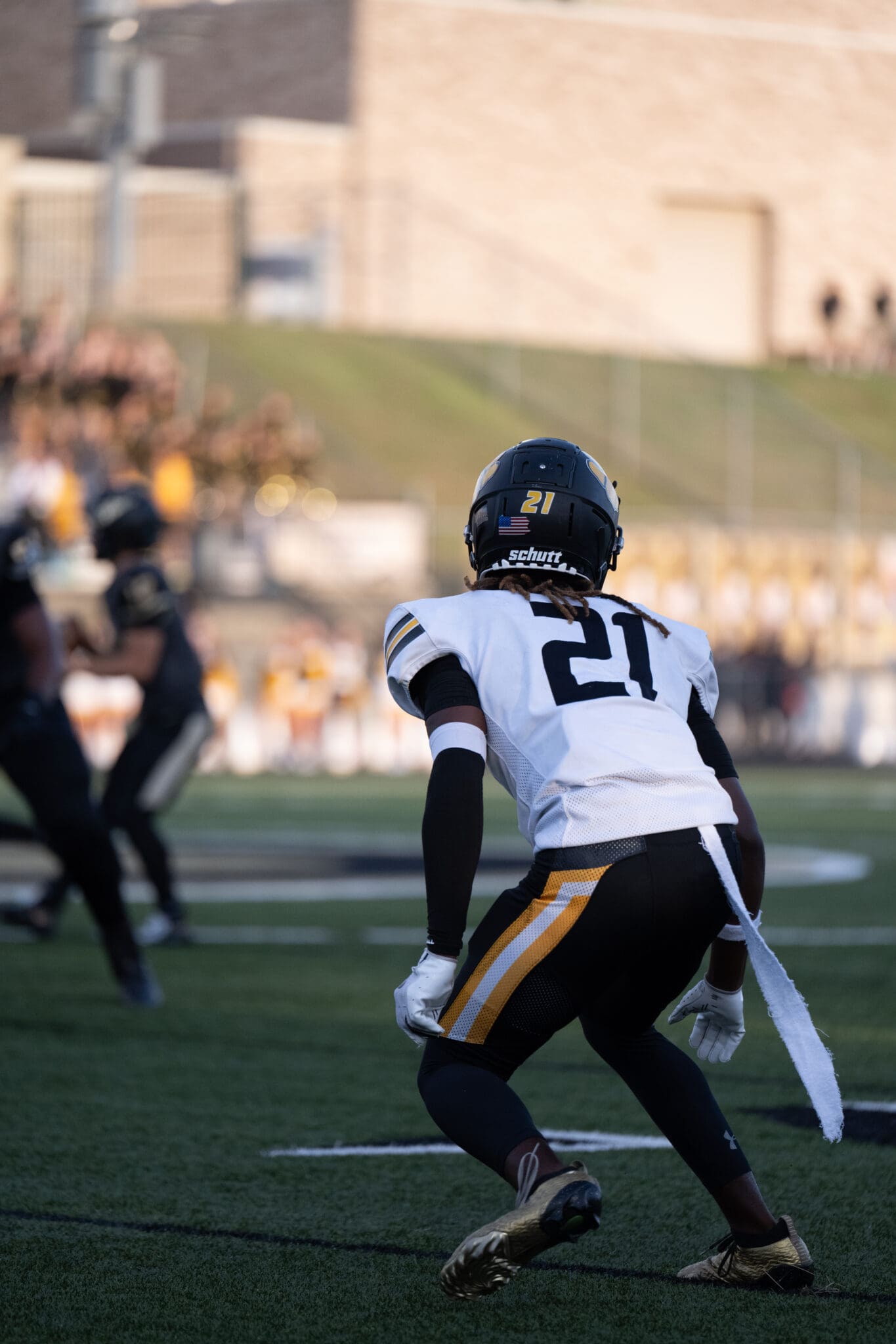 Football player in action on the field, wearing a number 21 jersey, ready for play.