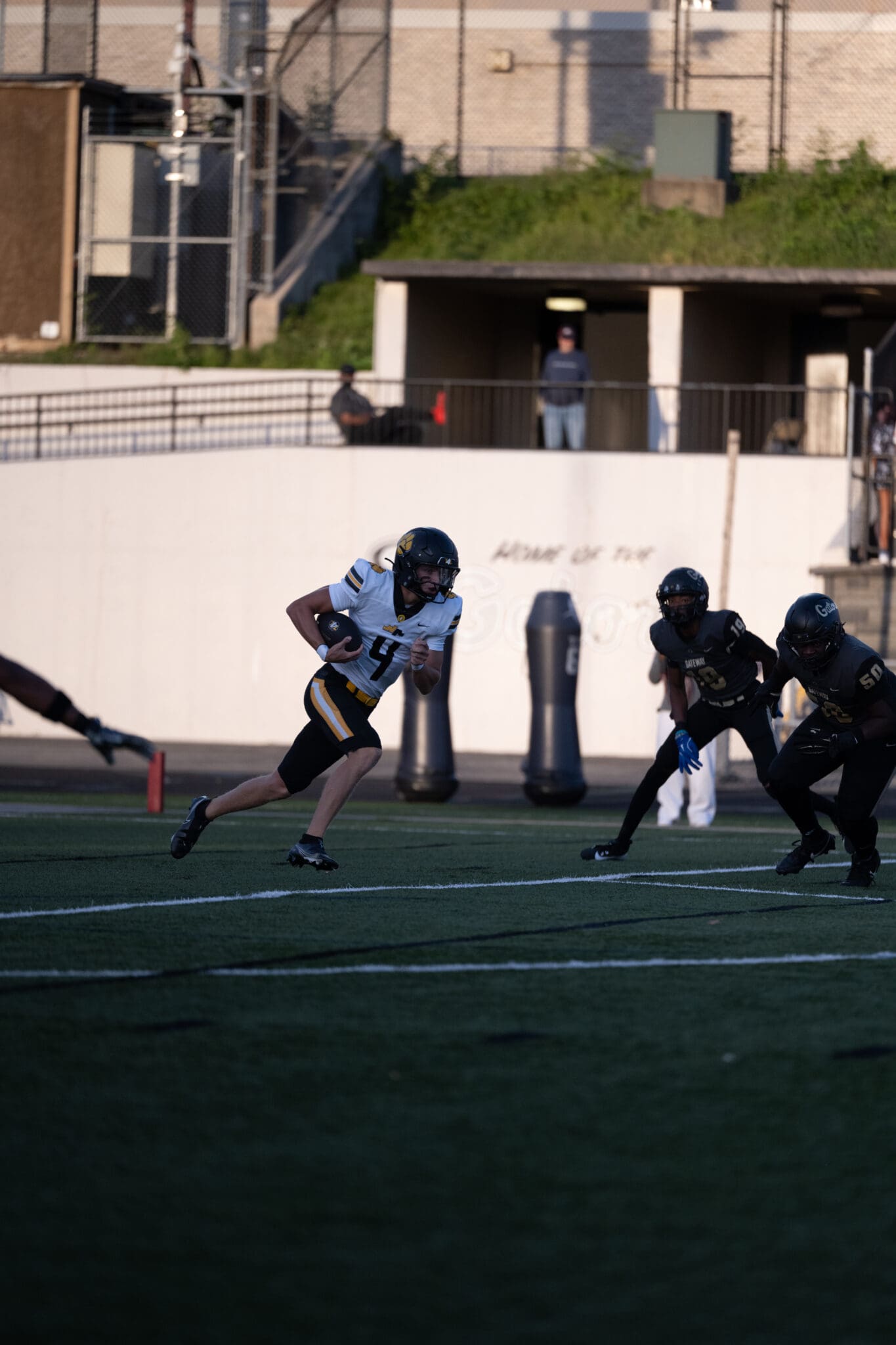 Football player in white jersey running with the ball, evading opponents on a field during a game.