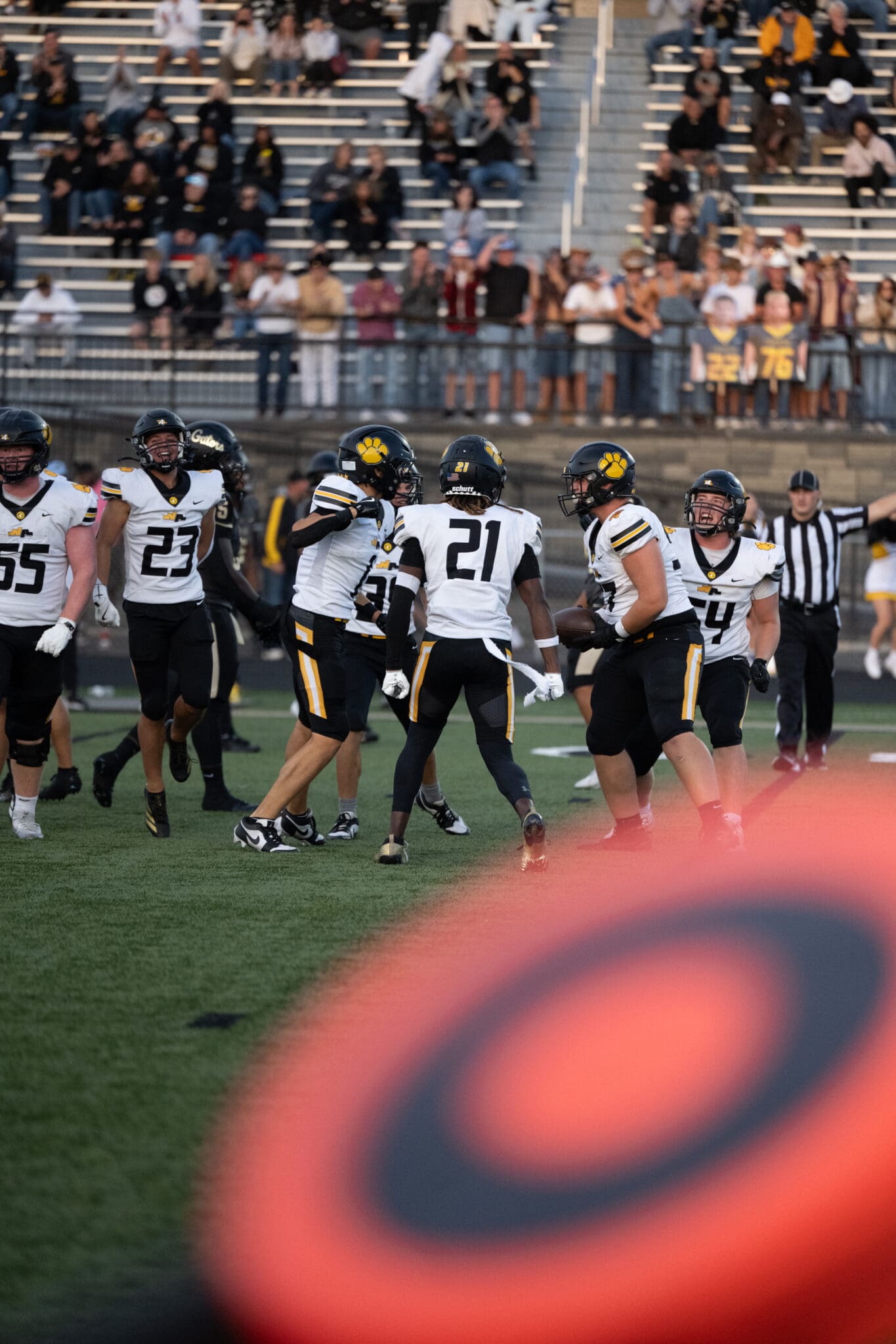 Football players celebrating after a successful play on the field, crowd cheering in the background.