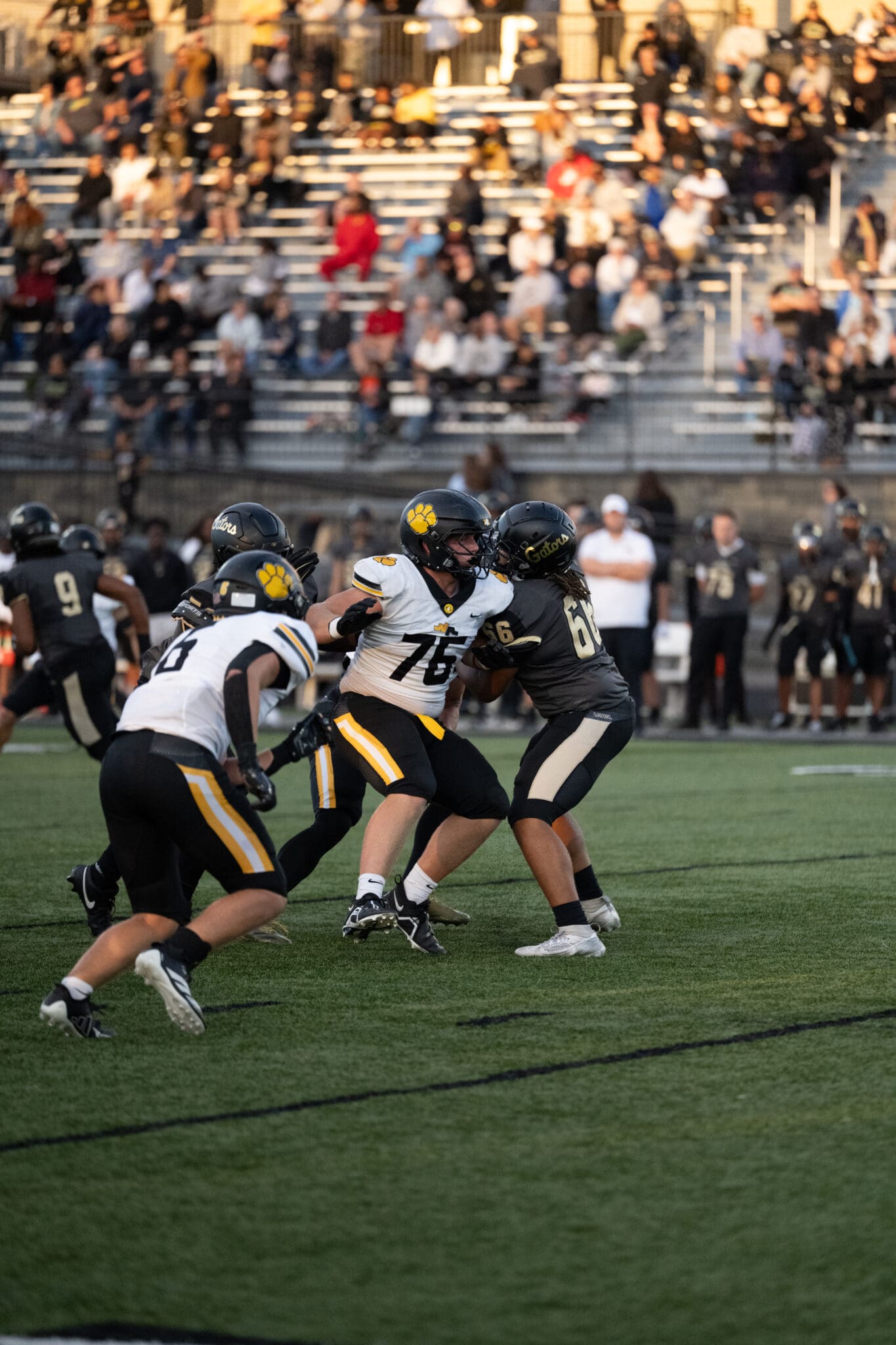 High school football players competing in a game, with spectators in the stands during a sunny afternoon.