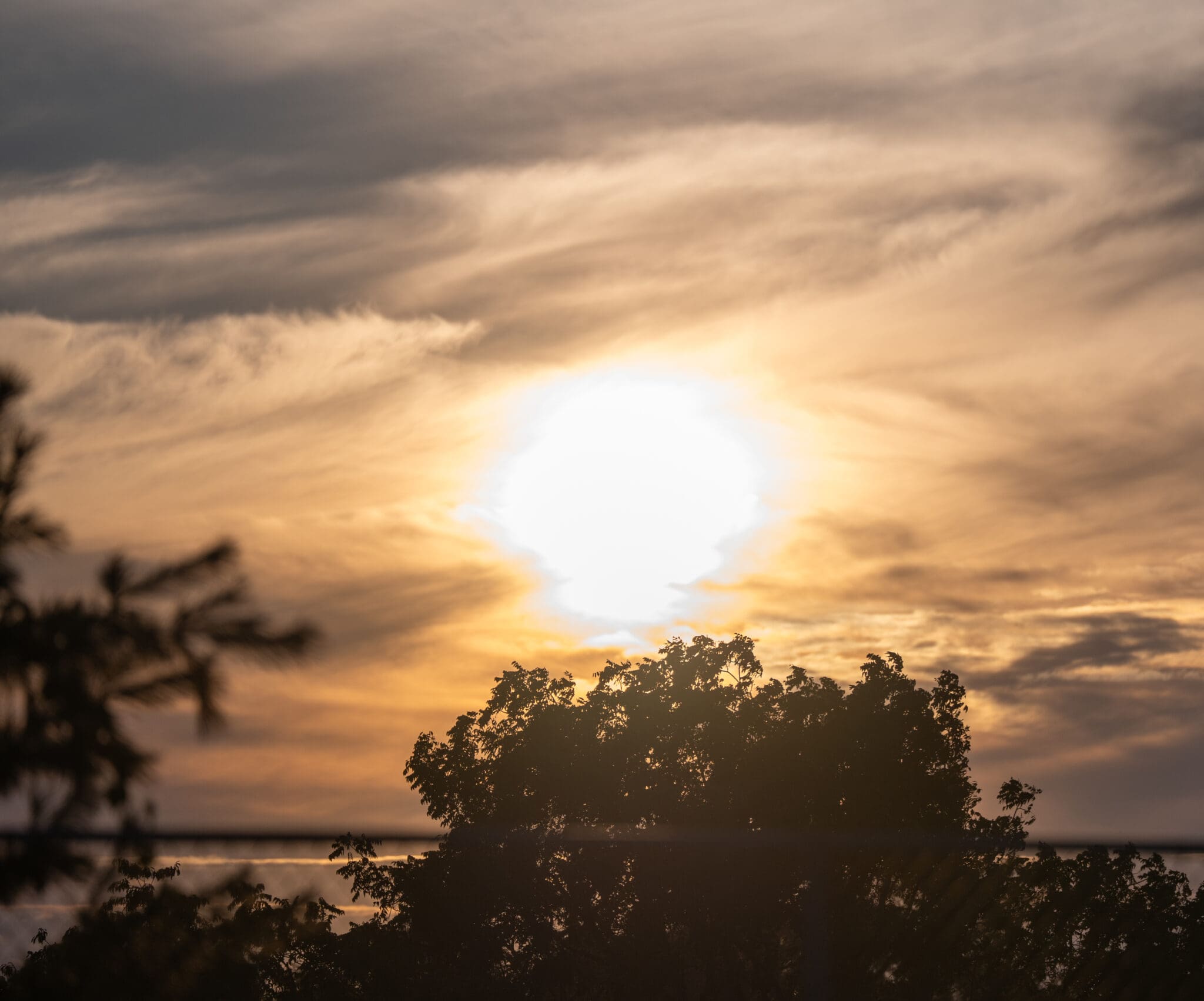 Sunset over silhouetted trees with dramatic clouds in the sky.