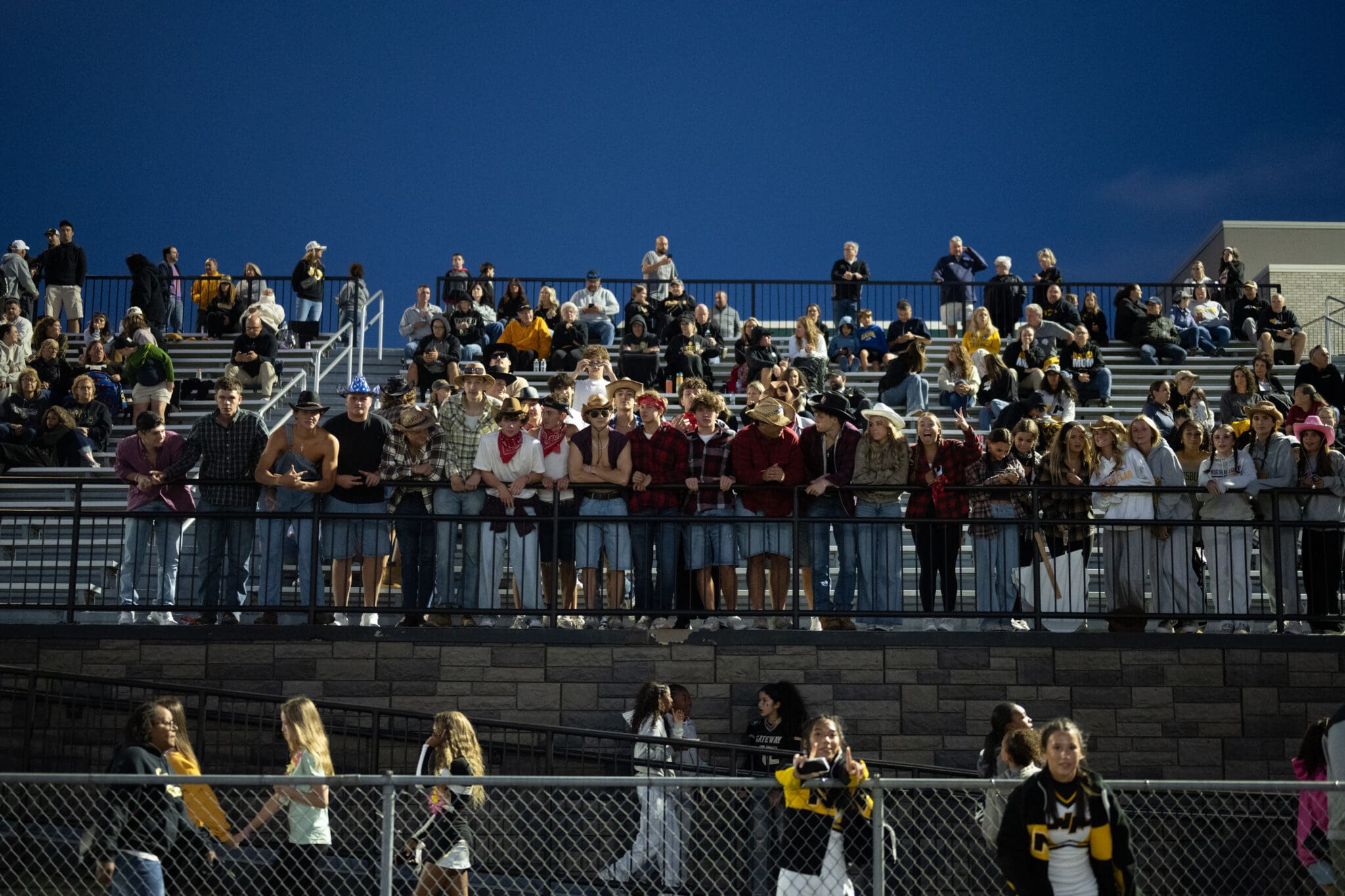 Crowd of enthusiastic fans in stadium bleachers during a nighttime sports event, enjoying the live action.