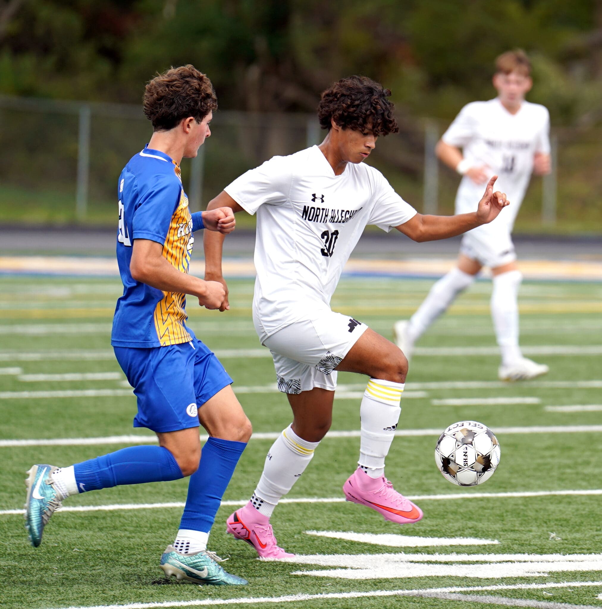 Two soccer players in action on a field, one in blue and one in white, focusing on the ball.