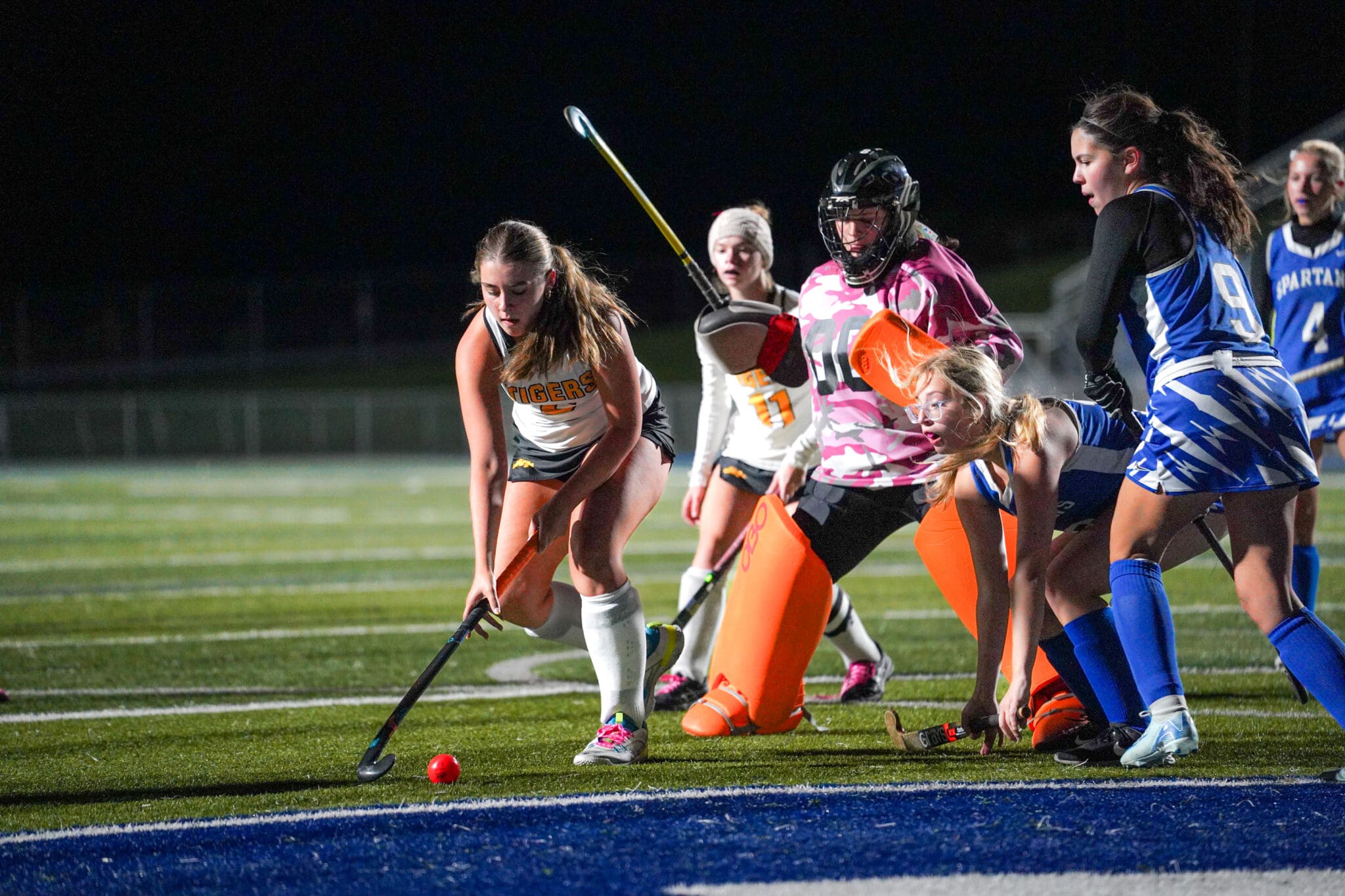 Field hockey match action with players competing for the ball under bright stadium lights.