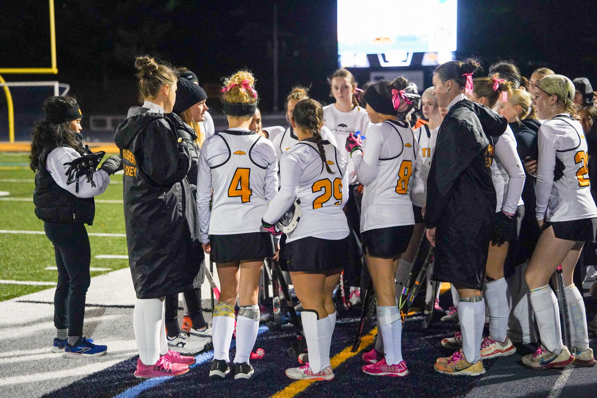 Women's field hockey team in a huddle on the field at night, preparing for a game.