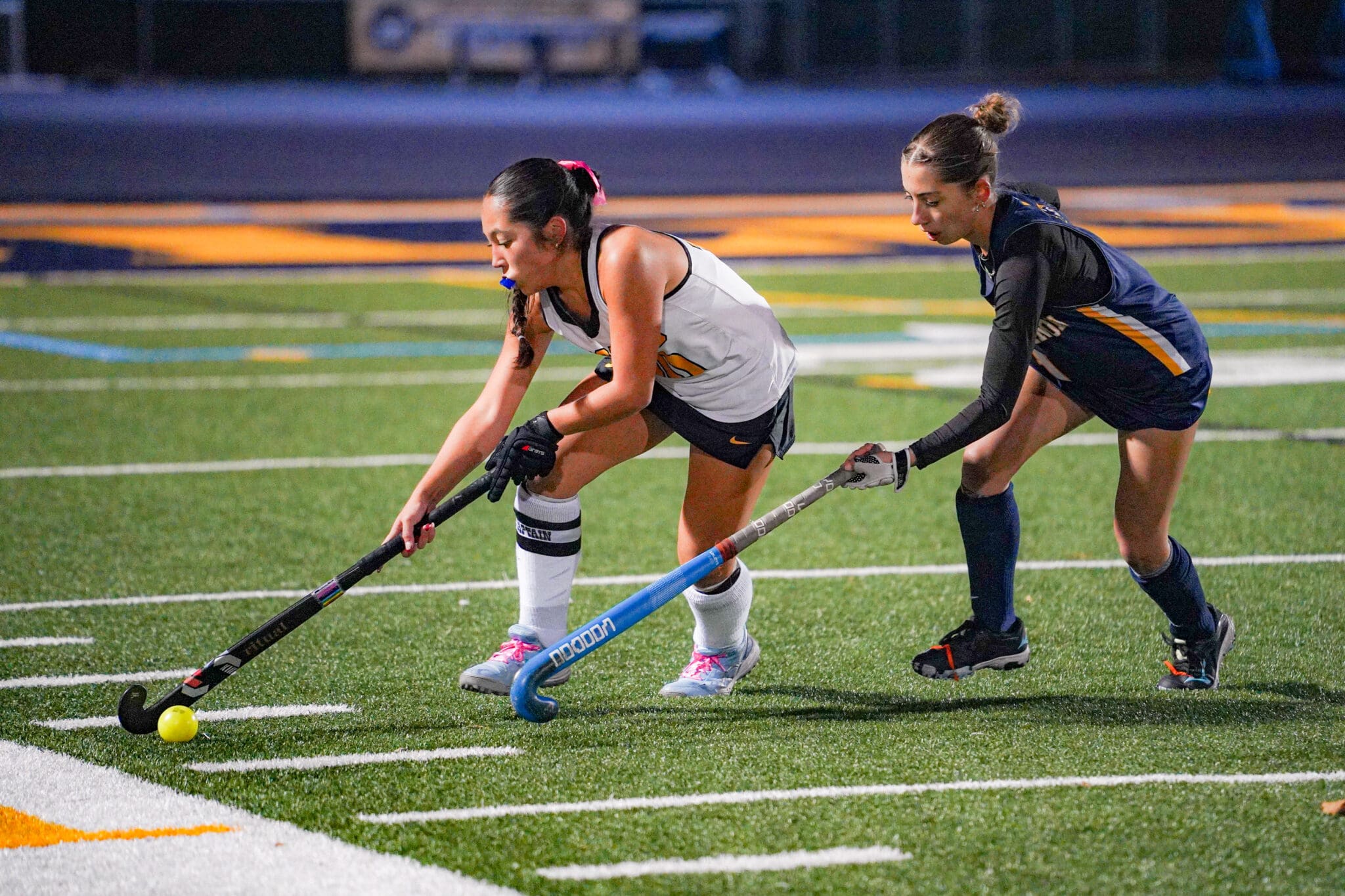 Two field hockey players compete for the ball on a green turf field during a match.