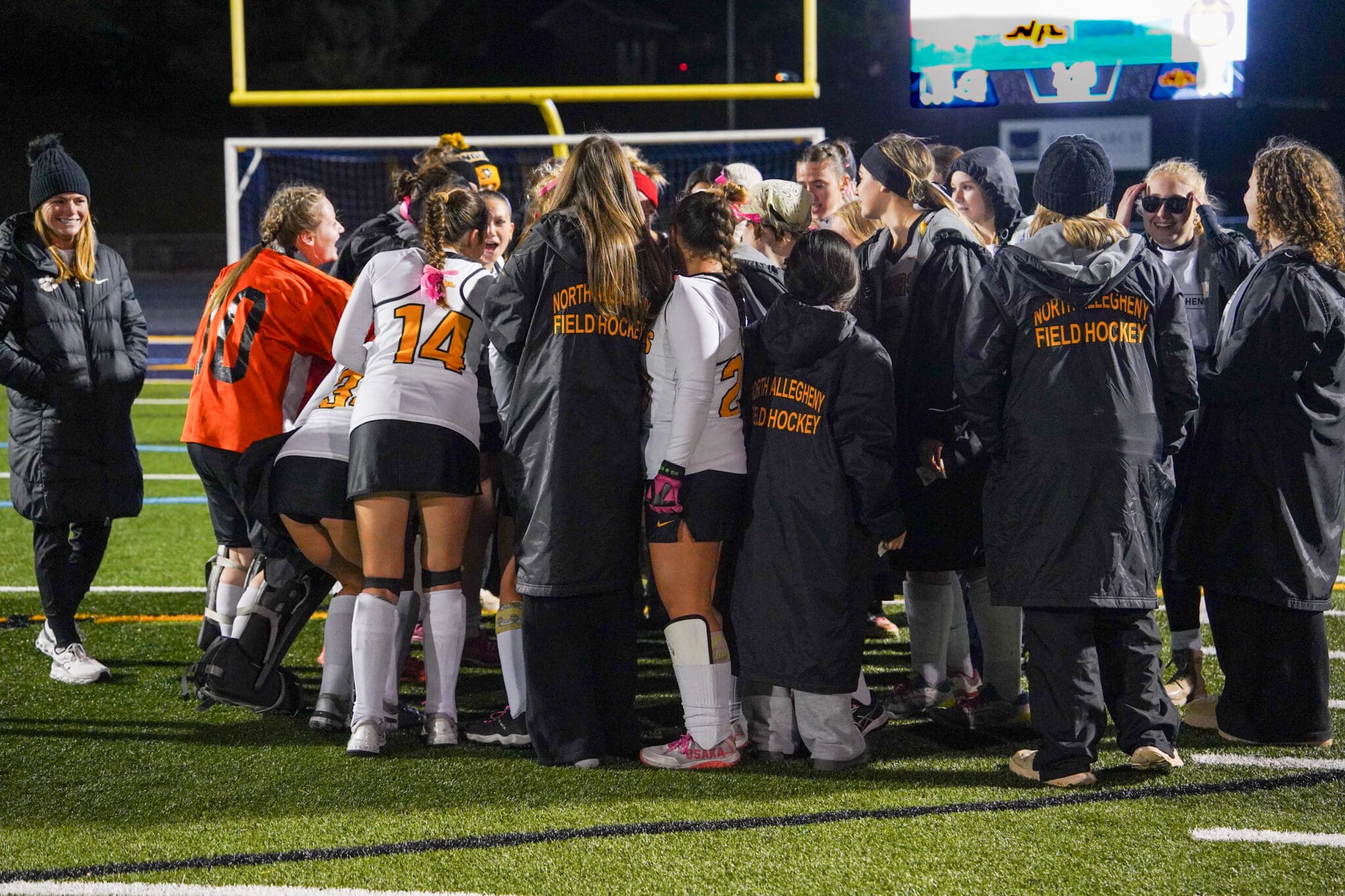 North Allegheny field hockey team huddles on the field, preparing for a match under stadium lights.