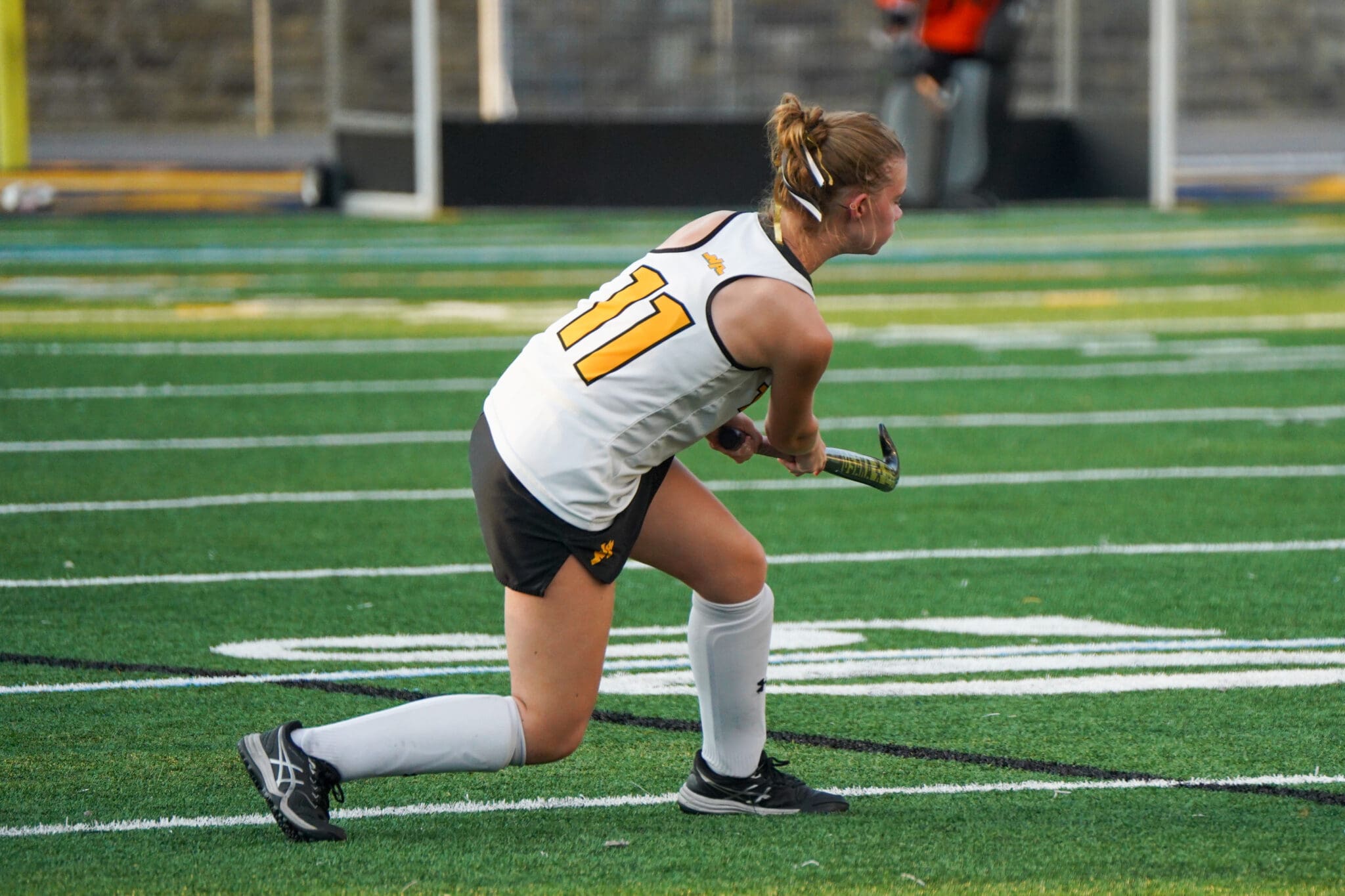 Field hockey player in action, poised with stick on green turf field, wearing jersey number 11.