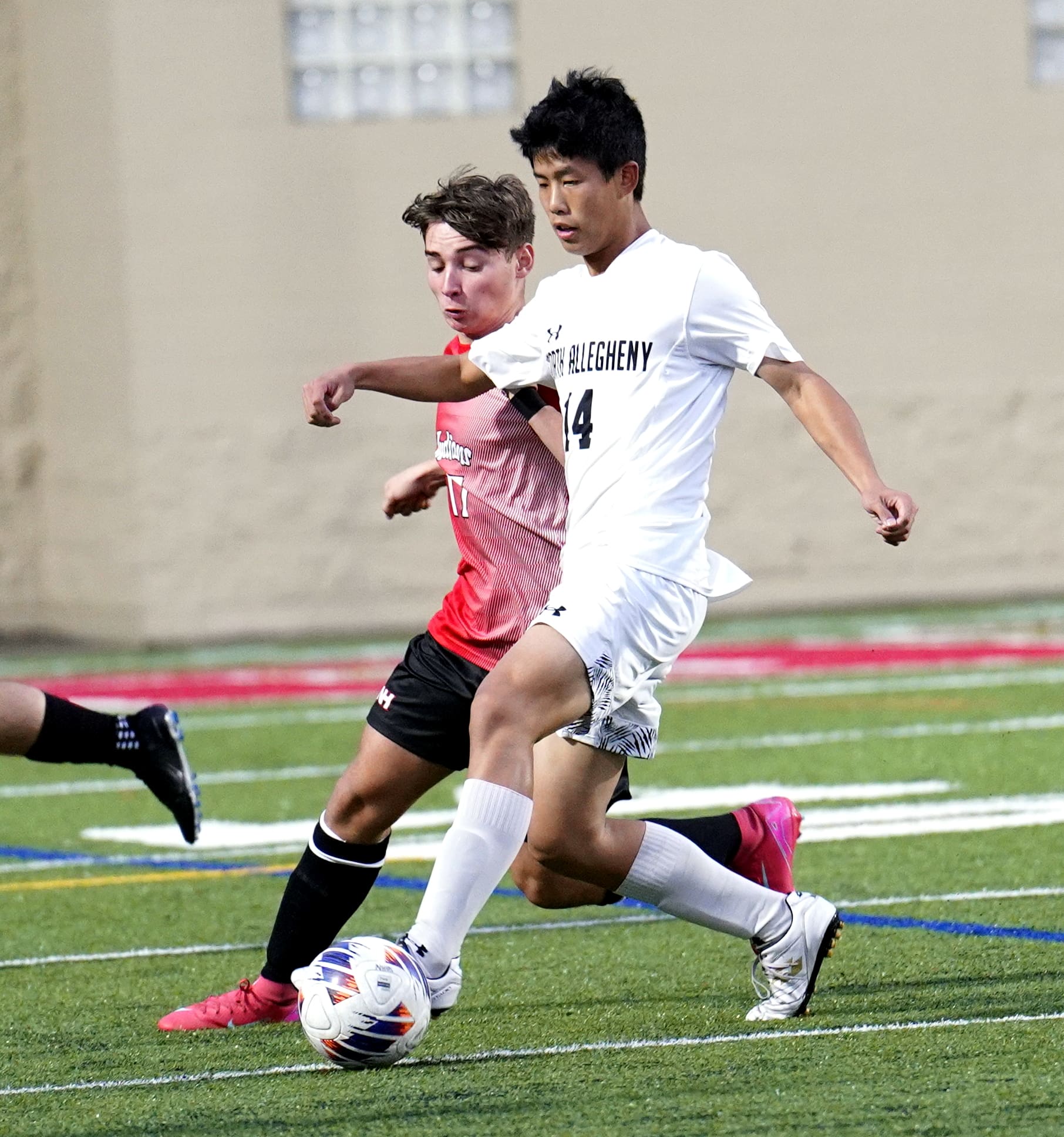 Two soccer players compete for the ball during an intense match on a green field, showcasing athletic skill.