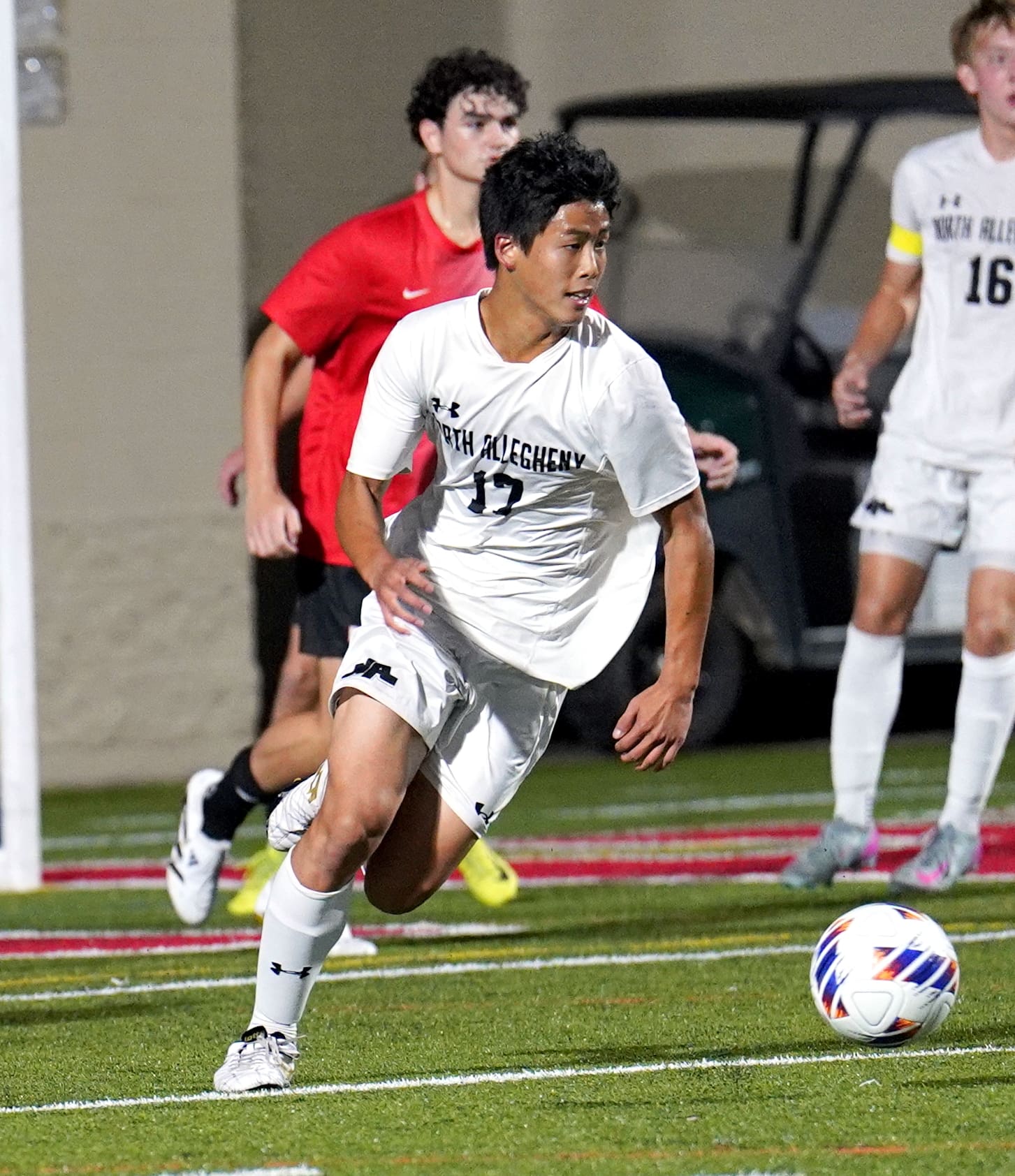 Soccer player in white sprinting towards the ball during a match on a field, with teammates and opponents nearby.