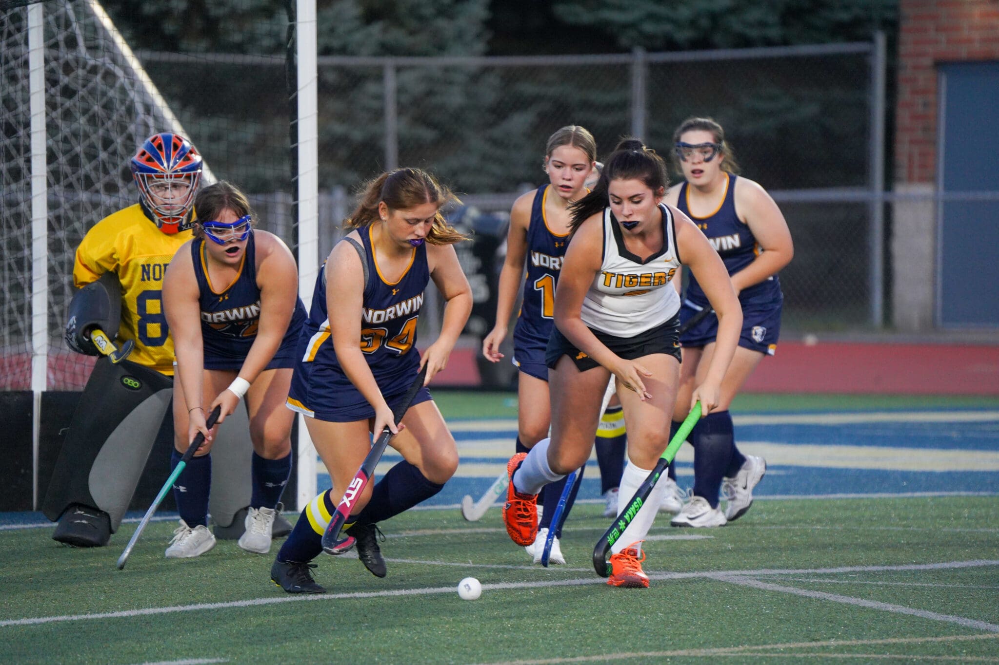 Field hockey players in action, competing for the ball on a green field, with goalie standing in the goal area.