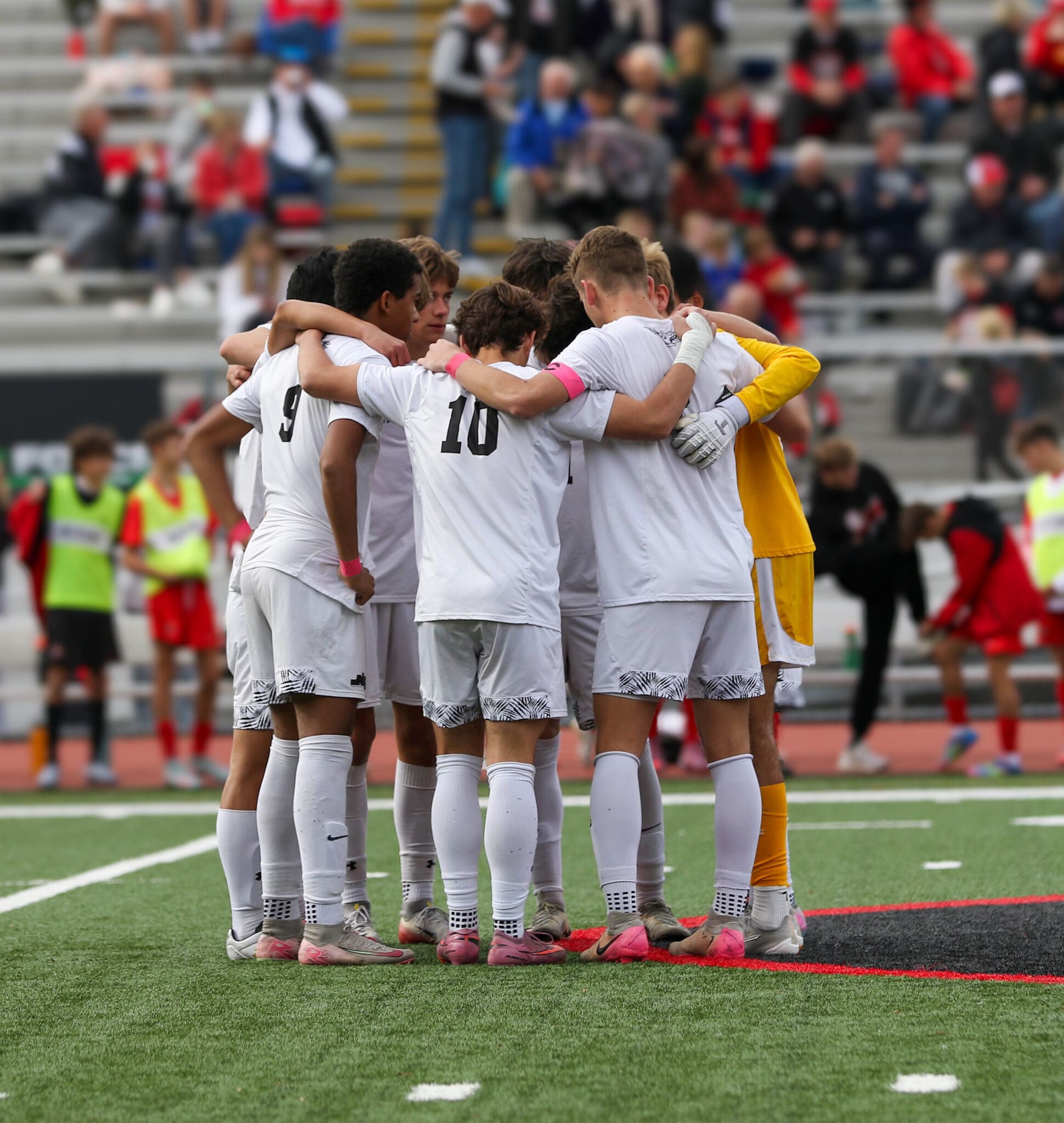 Soccer team huddle on field in white uniforms, preparing for a match in a stadium with spectators in background.