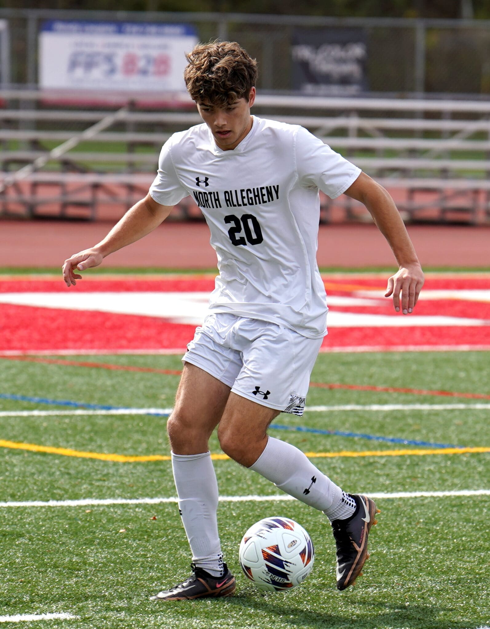 Soccer player in white uniform dribbling ball on field during daytime game.