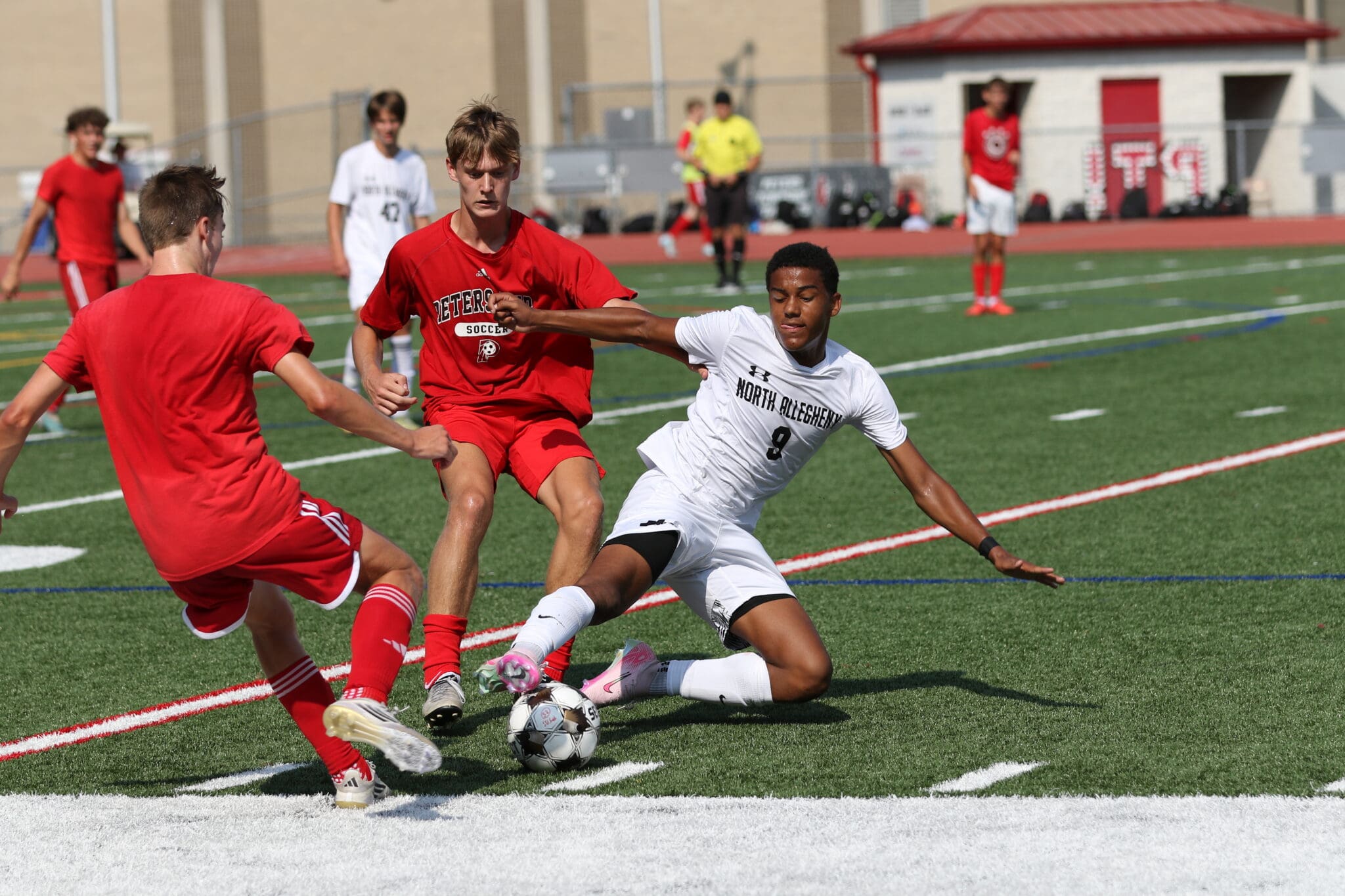 Soccer players in red and white uniforms vie for the ball on a sunny field during a competitive match.