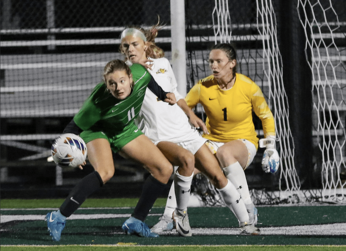 Soccer players compete intensely near goalpost during match, focused on ball control and defense strategy.