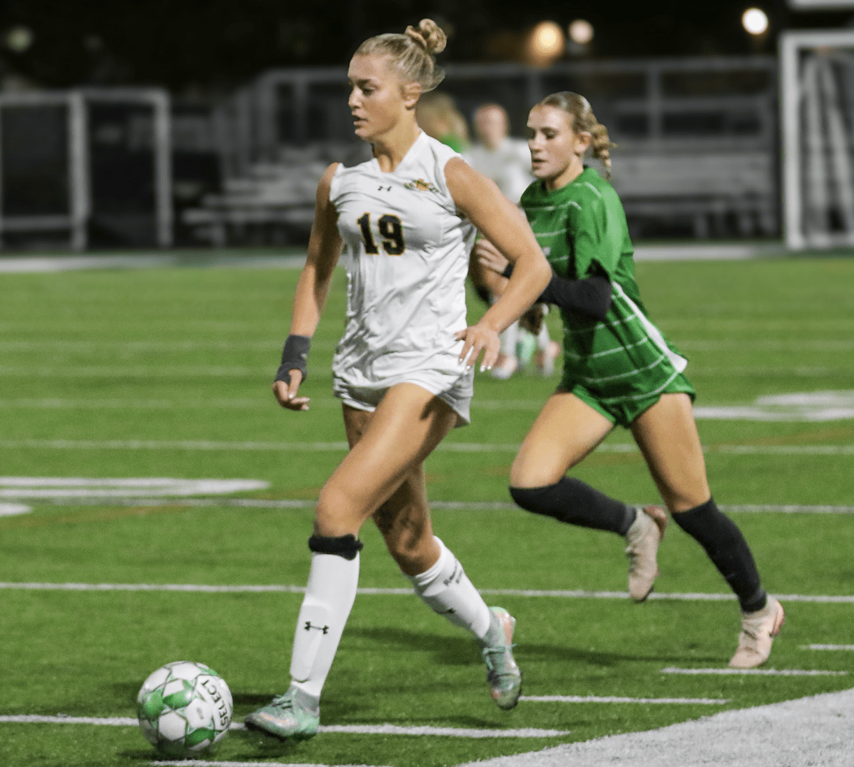 Two female soccer players competing in a match under stadium lights; player in white dribbles the ball, closely followed by a defender.
