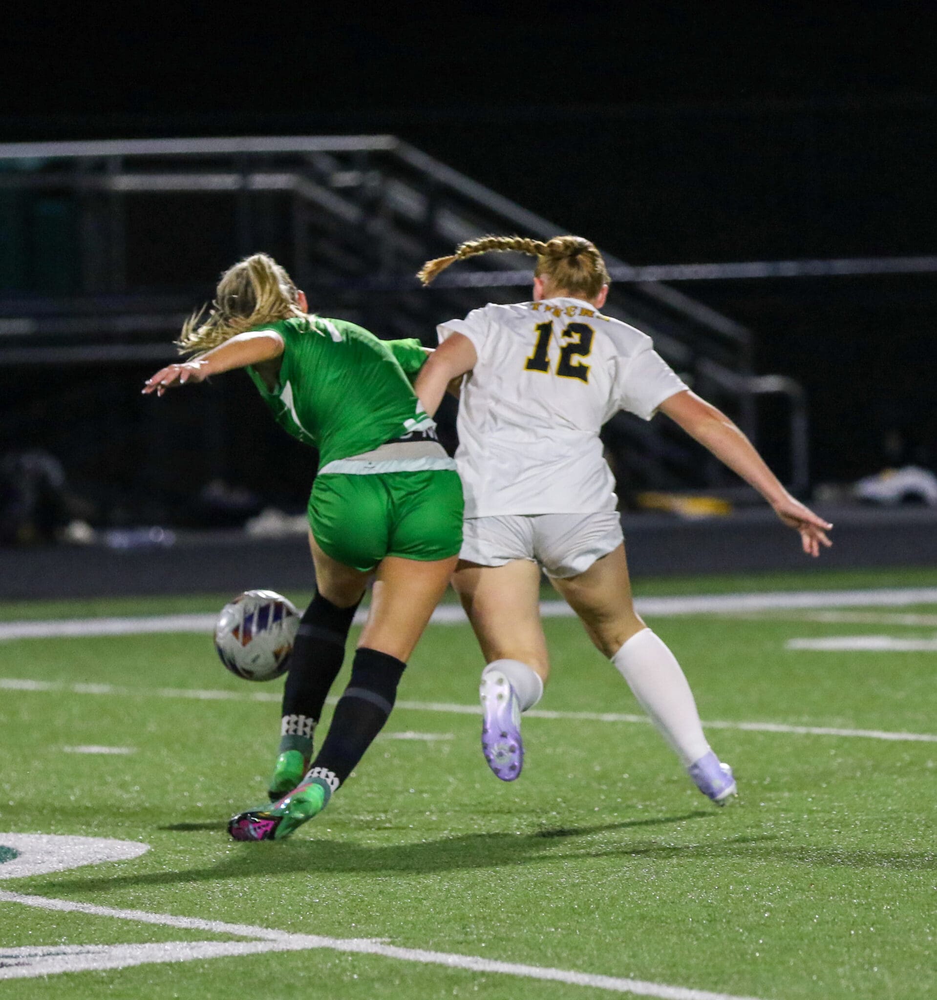 Two female soccer players in motion during a night game, competing for the ball on the field.