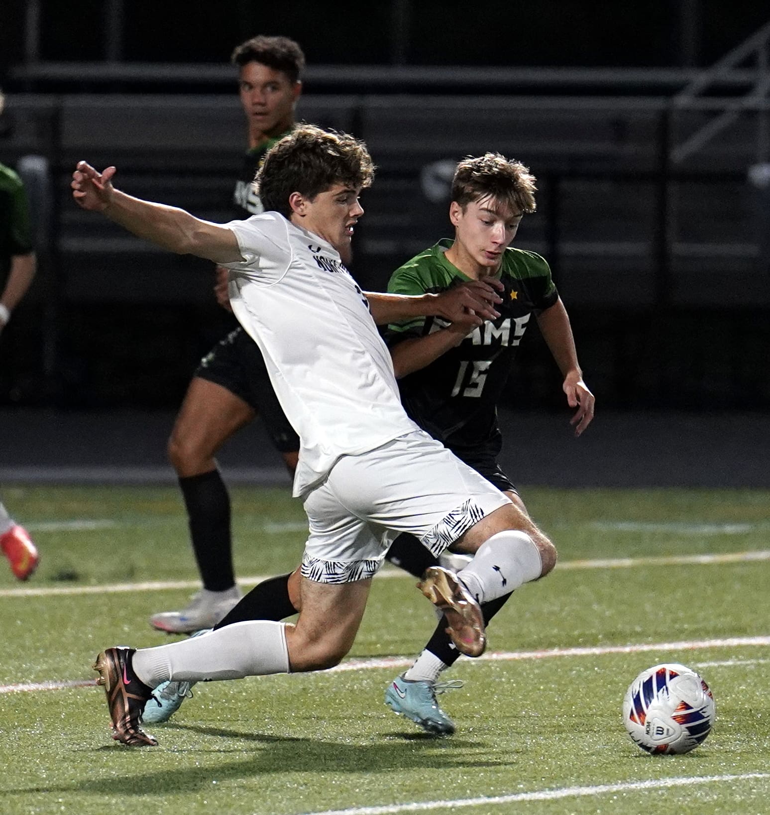 Soccer players in action during a match on a green field at night, focused on kicking the ball.
