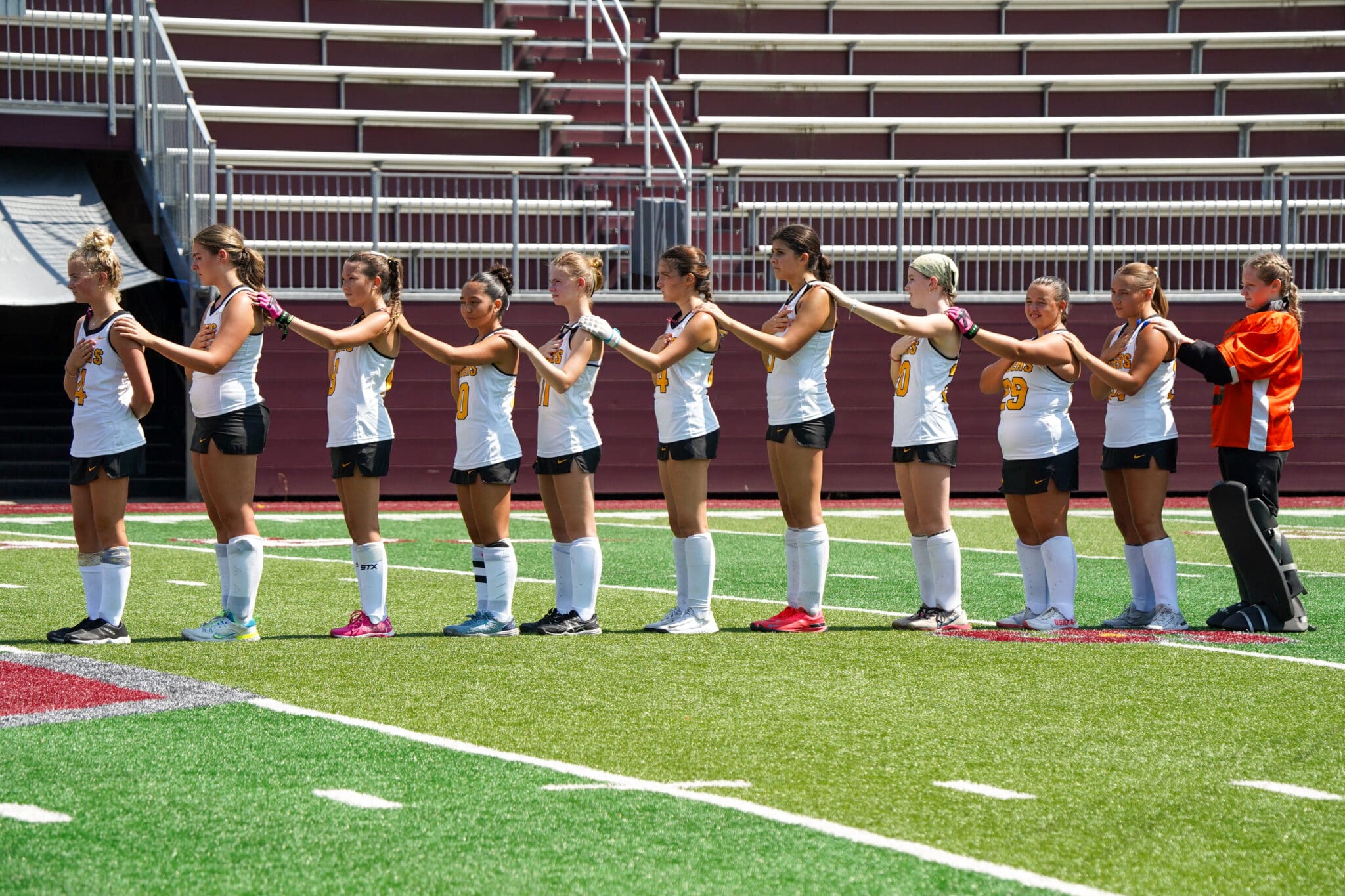 Field hockey team standing in line on a field, wearing uniforms and preparing for the game.