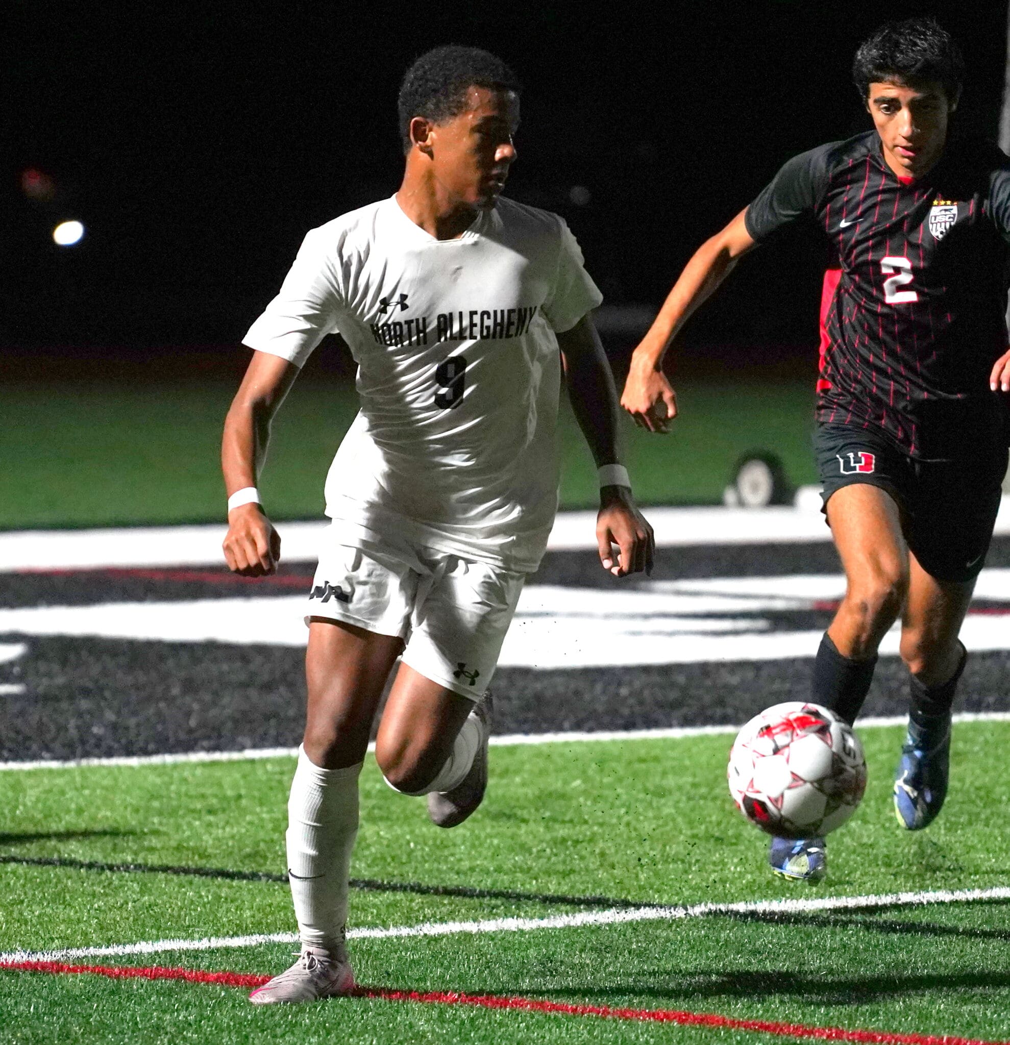 Soccer players in action during a nighttime match, focused on controlling the ball on a lit field.