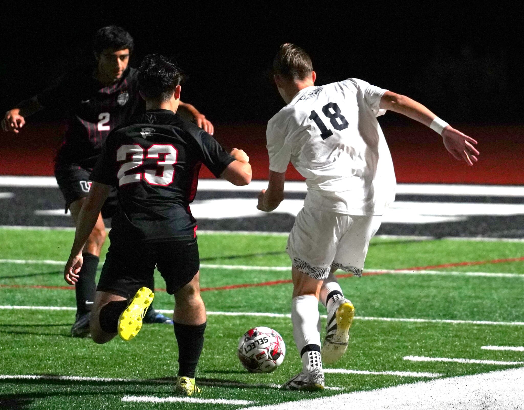 Soccer players in action on the field during a night match, wearing black and white uniforms with a ball in play.