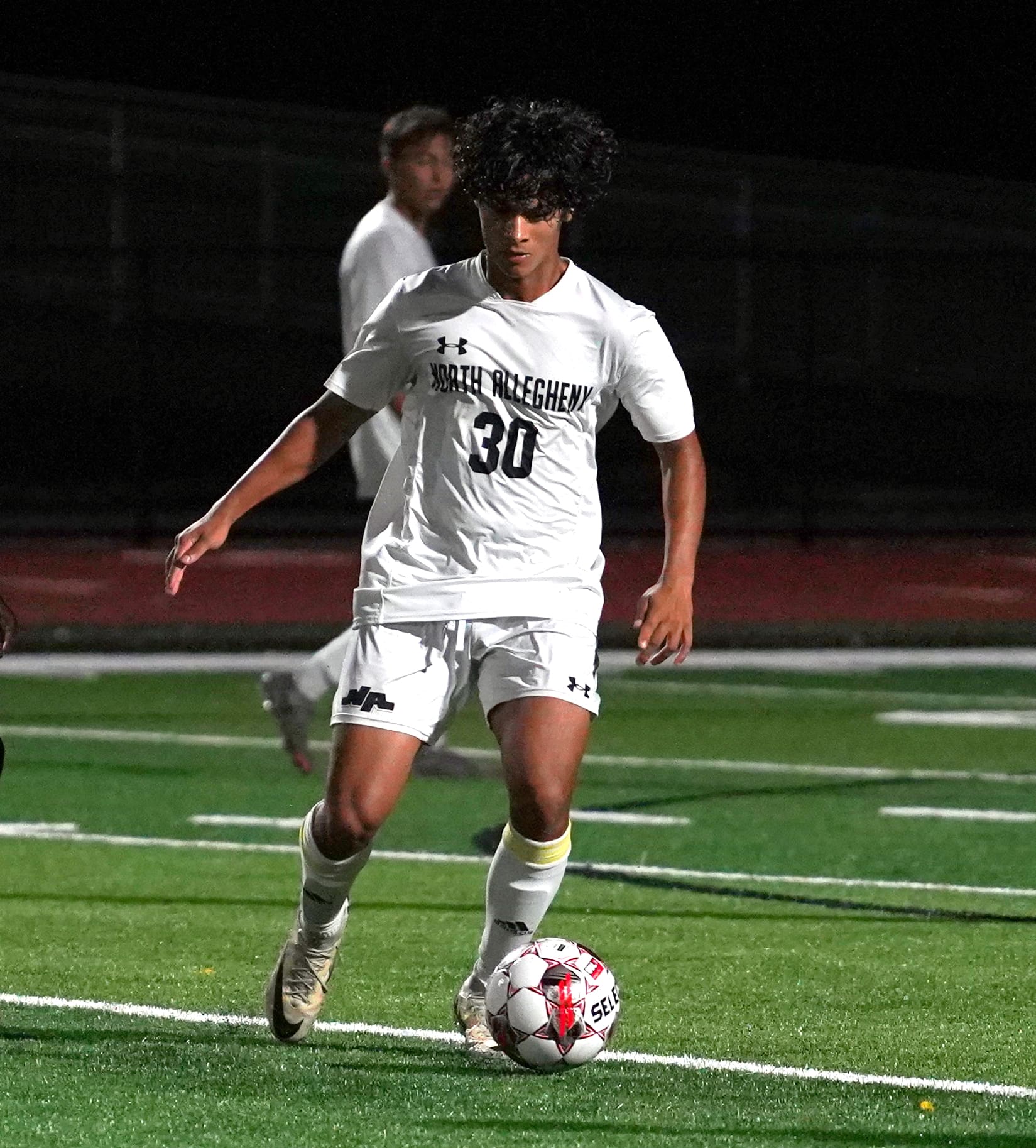 Soccer player in white uniform dribbling soccer ball on field at night game.