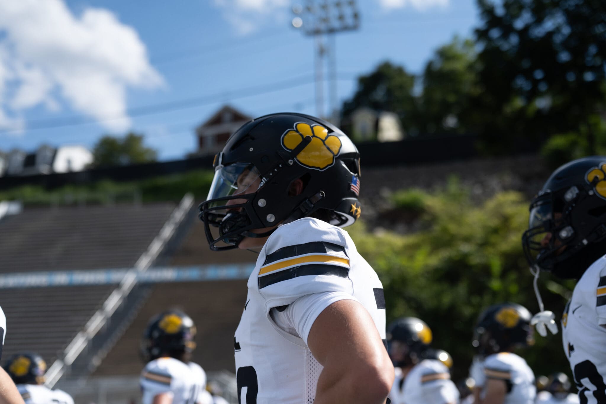 Football player in uniform and helmet with paw logo, standing on field during a sunny day practice.