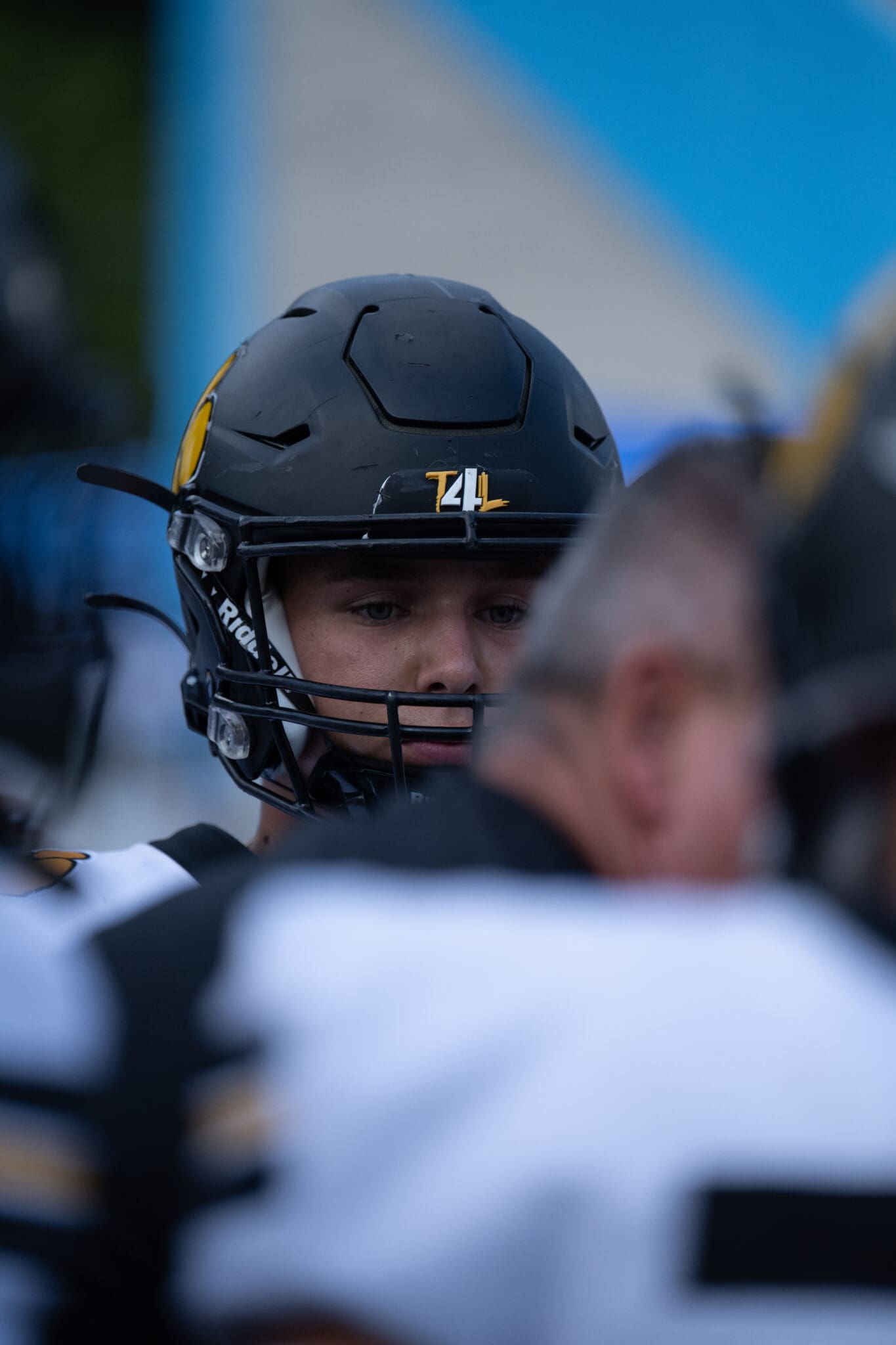 A football player in a black helmet focused before a game, surrounded by teammates in blurred foreground.