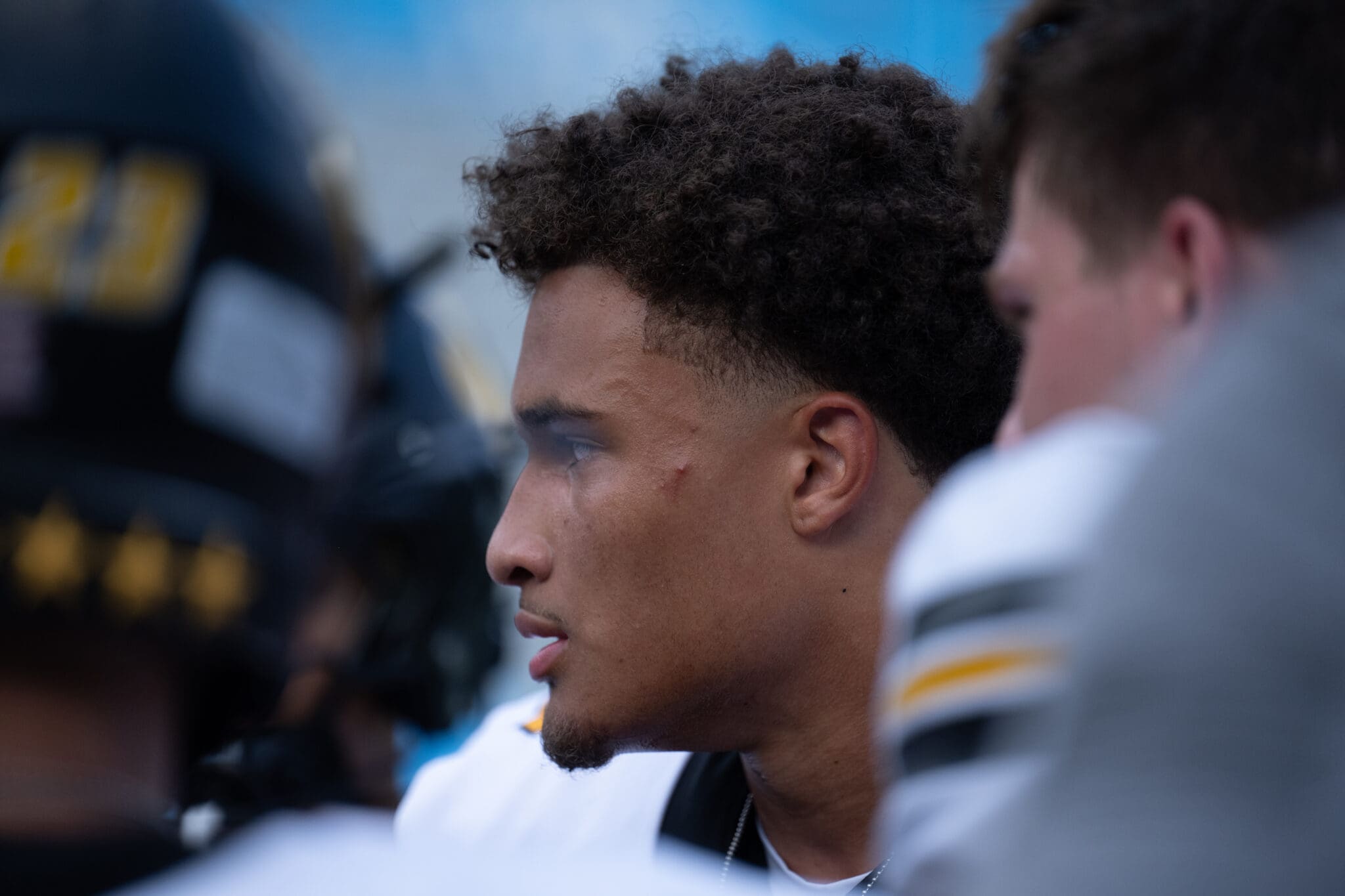 Football player on the sidelines, focused and intense, during a game wearing a black and white uniform.