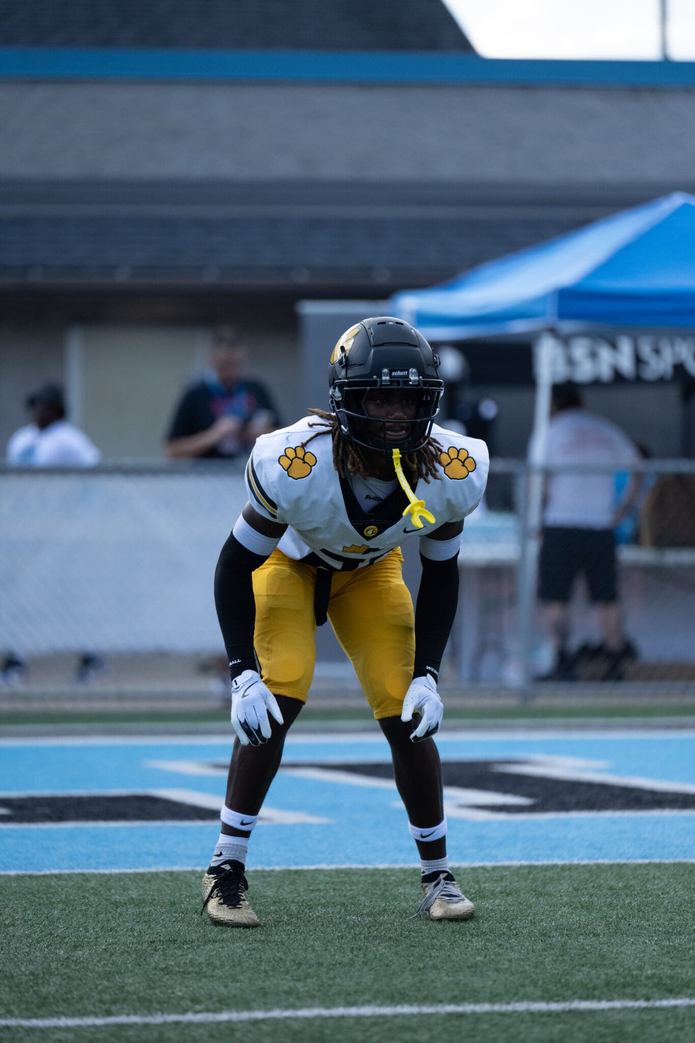Football player in yellow pants and black helmet prepares on field during game.