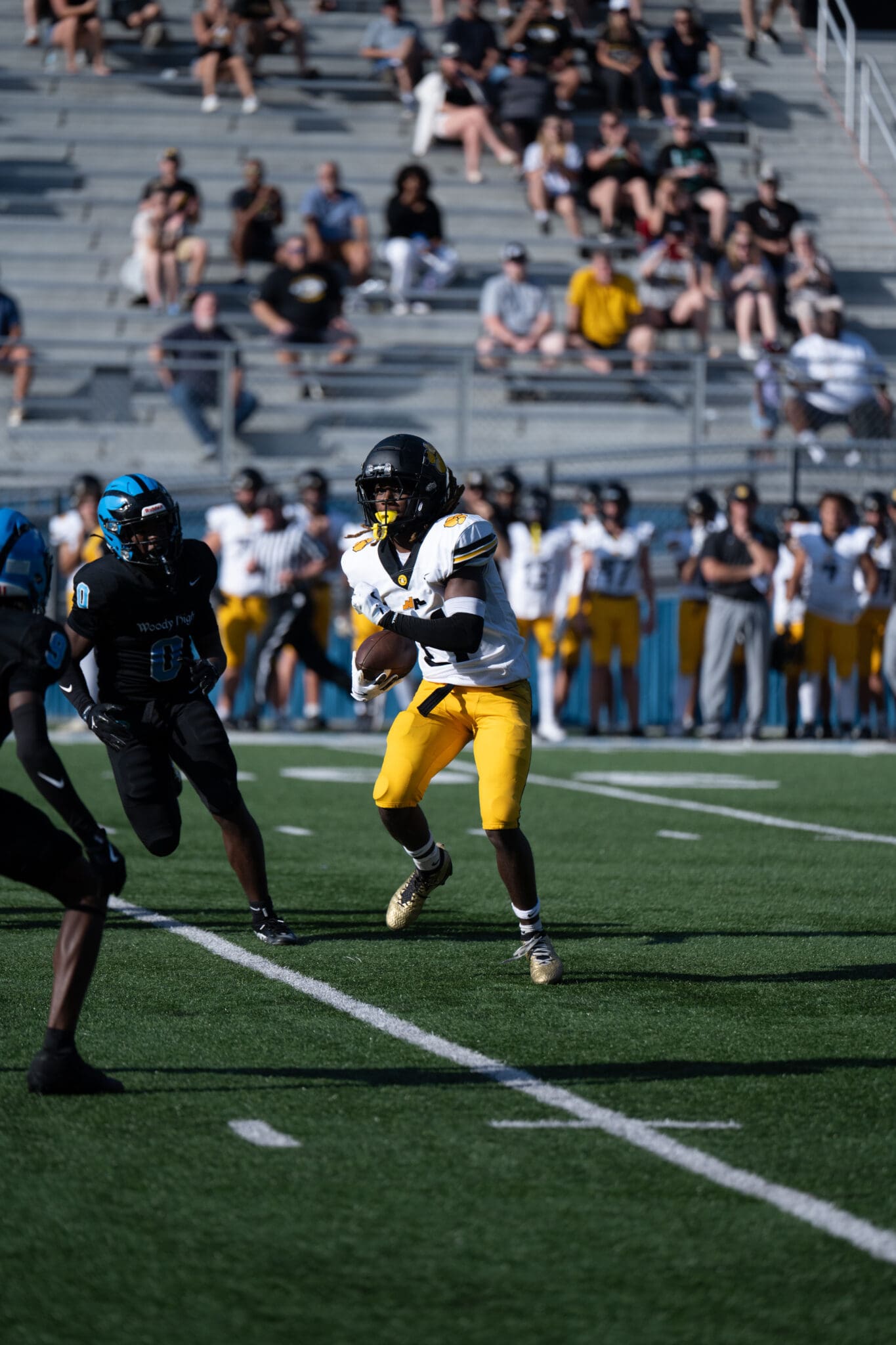 Football player in yellow and white uniform runs with the ball on a field, opposing team in pursuit.