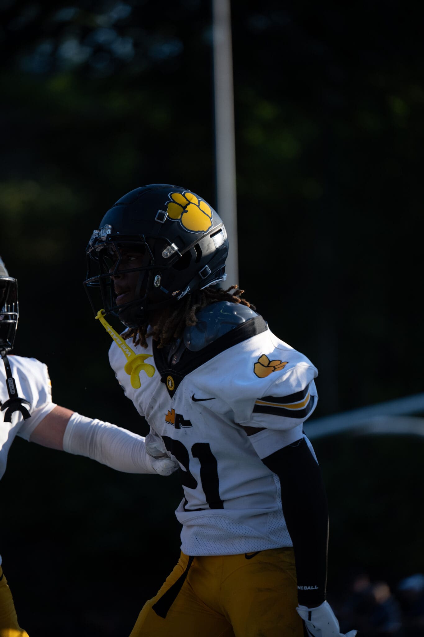 Football player in black helmet with yellow paw logo during a game, wearing white and yellow uniform.