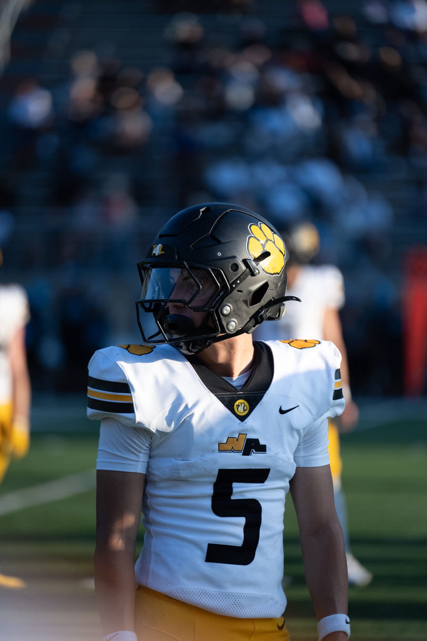 Football player in black helmet and white jersey with number 5, on a field during a game.