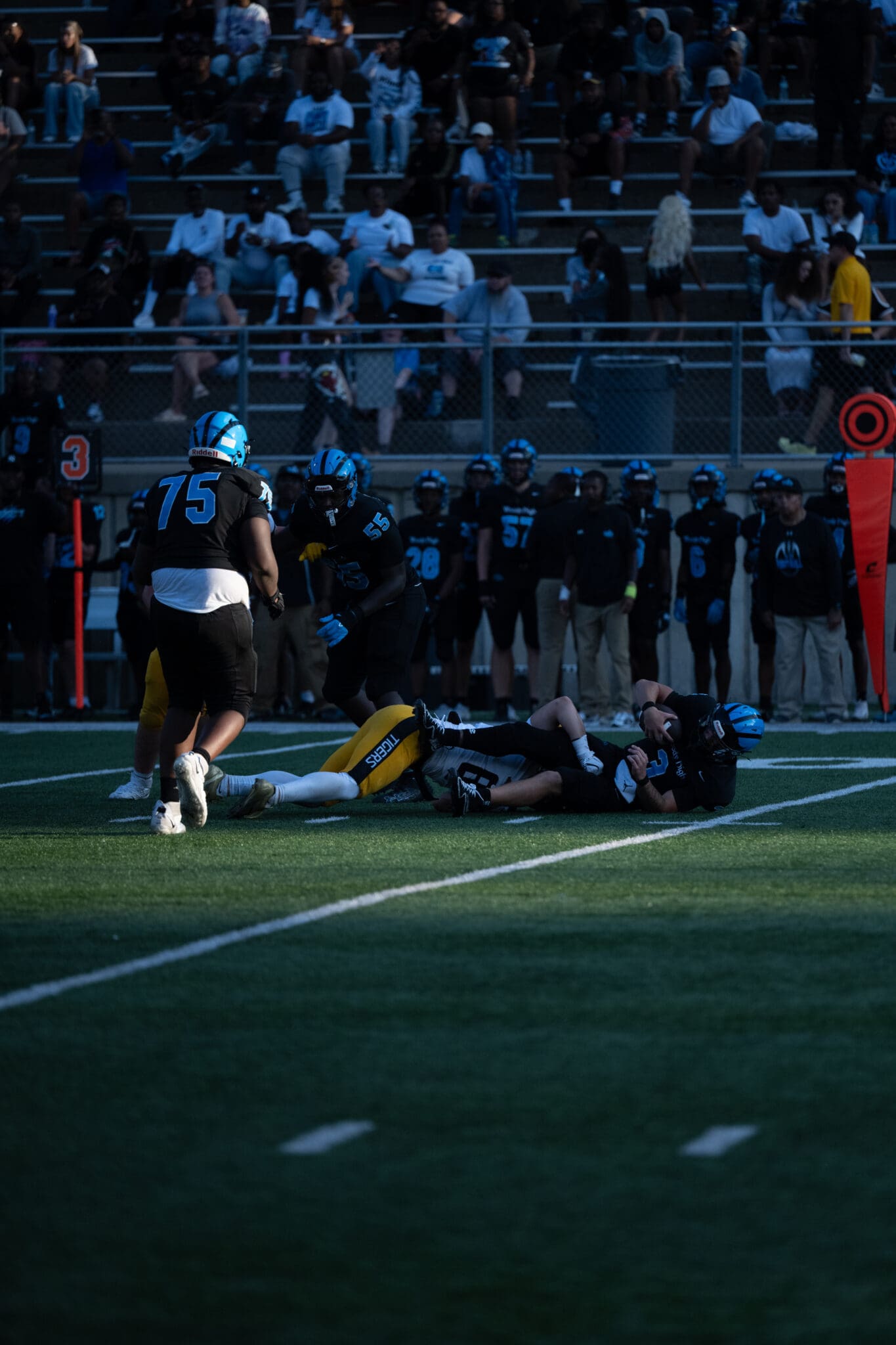 Football players in action during a game with a large crowd in the stands, wearing blue and black uniforms.