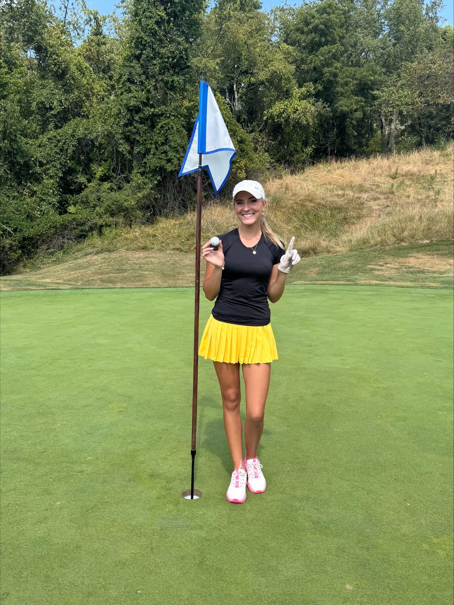 Golfer celebrating a successful hole-in-one on a sunny golf course, holding ball near flagstick.